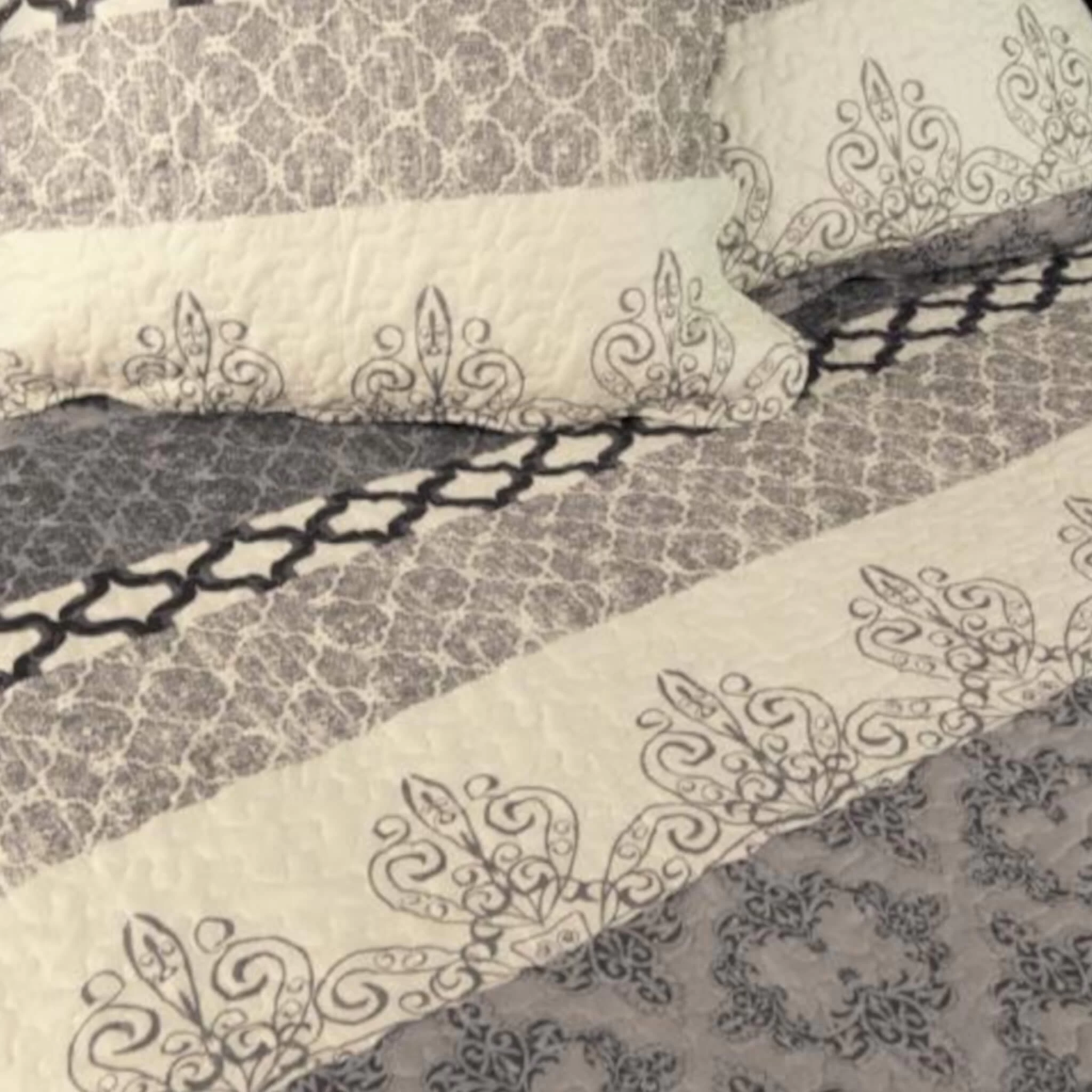 Couvre-lit Blois, de la marque Terre de Nuit. Grâce Ă ses diffĂ©rents motifs arabesques disposĂ©s sous la forme de bandes, le couvre-lit Blois sublimera votre dĂ©coration d’intĂ©rieure par son originalitĂ© et son authenticitĂ©. Ses coloris gris et blanc s’adaptent Ă tous les types d’univers en ajoutant une touche d’Ă©lĂ©gance et de raffinement. En plus d’ĂŞtre un Ă©lĂ©ment de dĂ©coration, ce couvre-lit vous offre du confort et bien-ĂŞtre Ă chaque moment de dĂ©tente, grâce Ă son boutis matelassĂ© et sa composition 100% polyester.