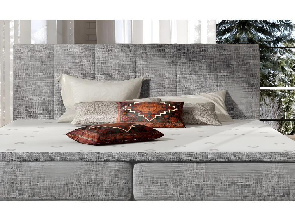 Un lit boxspring est synonyme de confort et de bonne nuit de sommeil. GrĂące Ă la hauteur du matelas et des caractĂ©ristiques de confort haut de gamme. DotĂ© d’un matelas Ă ressorts Bonnell de 20 cm dâĂ©paisseur avec des couches supĂ©rieure et infĂ©rieure de mousse T25 HR rĂ©silientes, d’une Ă©paisseur totale de 4 cm. Le lit est livrĂ© avec un surmatelas de 4 cm en mousse T21. Cette configuration de matelas assure un sommeil de qualitĂ© optimale. Les matĂ©riaux de qualitĂ© garantissent un lit trĂšs confortable, avec sa surface de couchage stable qui favorise un bon soutien pour le corps, et est sain pour la colonne vertĂ©brale. Le lit boxspring va au-delĂ des niveaux de confort Ă©levĂ©s. Le design actuel et contemporain est adaptĂ© Ă tous les types dâintĂ©rieurs.