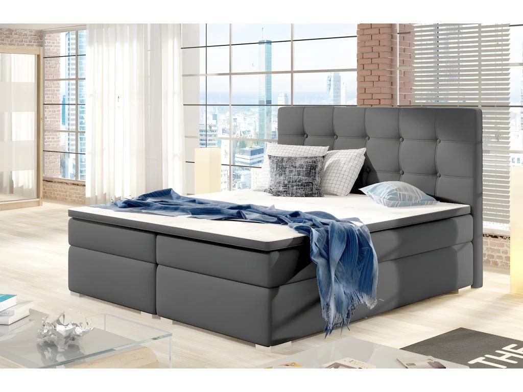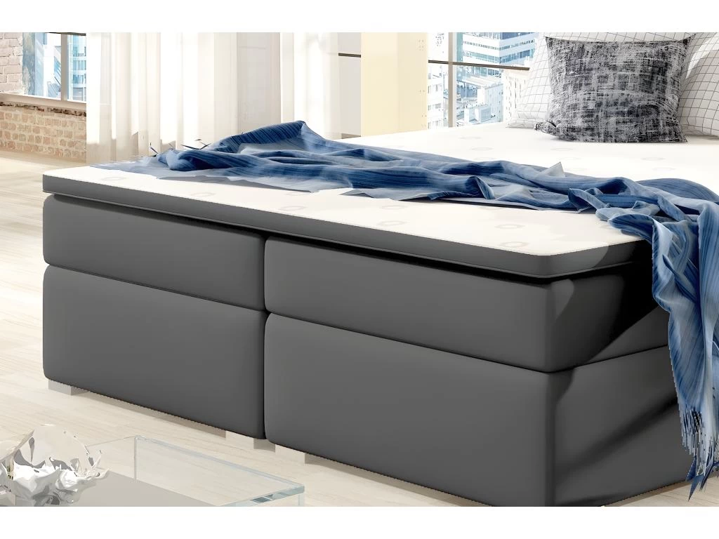 Ce lit de type boxspring, avec un matelas haut et une structure spacieuse et rembourrĂ©e. Dispose dâun matelas Ă ressorts bonnell d’une hauteur de 20 cm, Ă©quipĂ© de couches supplĂ©mentaires – haut et bas, en mousse T25 souple et d’un surmatelas en mousse T21 d’une Ă©paisseur de 4 cm. Le rembourrage se traduit par un confort maximal pendant le sommeil et un soutien adĂ©quat et stable du corps et un soulagement de la colonne vertĂ©brale. Le lit dispose d’un espace de couchage disponible dans plusieurs dimensions, assurant libertĂ© et confort de repos.