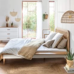 Le lit accompagnĂ© de sa tĂȘte de lit en cannage arbore un style scandinave Ă©purĂ©, caractĂ©risĂ© par des lignes simples, des finitions soignĂ©es et une esthĂ©tique minimaliste. Il apportera une atmosphĂšre harmonieuse et contemporaine Ă votre chambre Ă coucher.