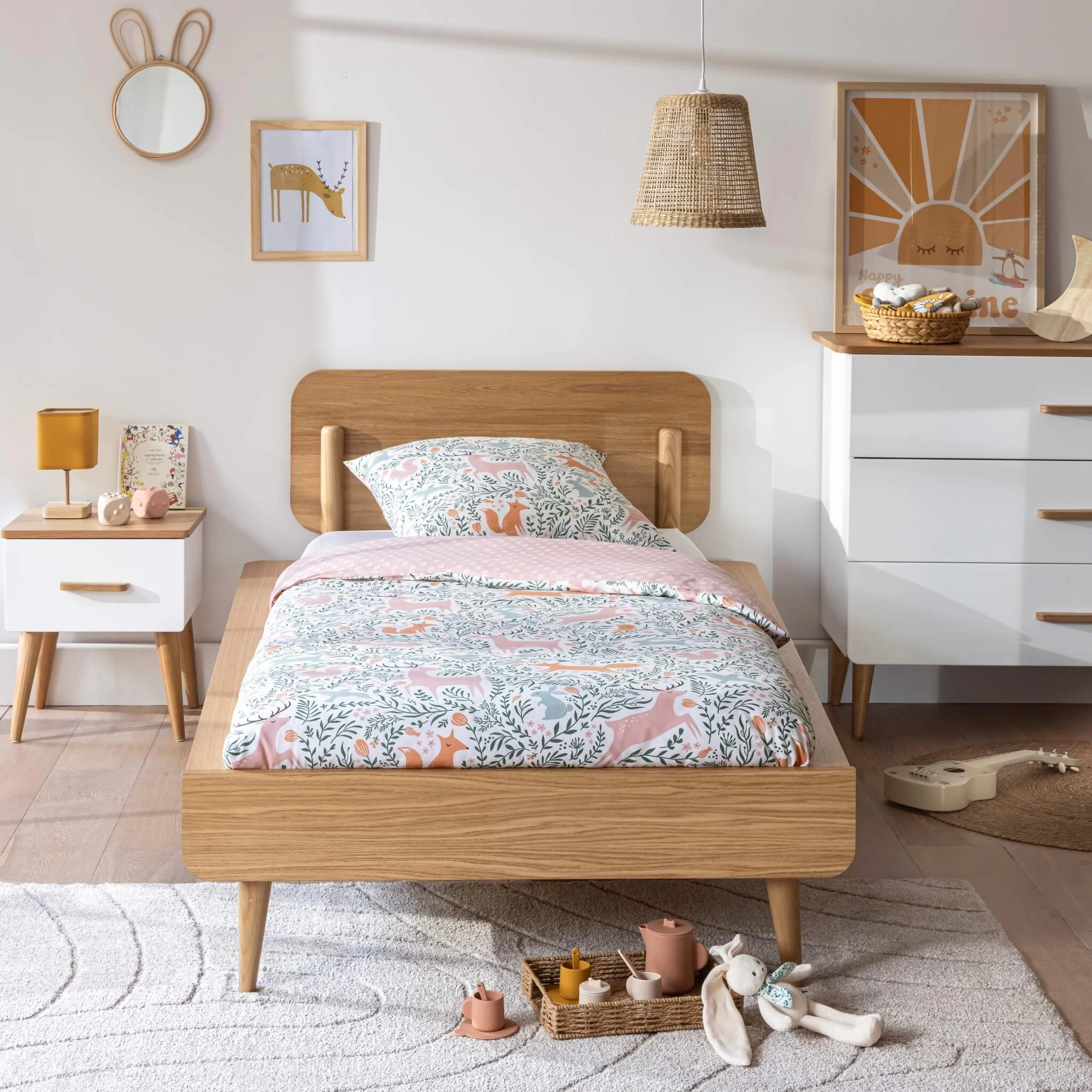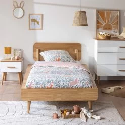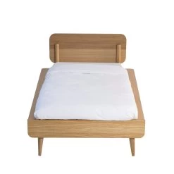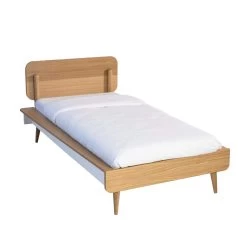 Le lit est fabriquĂ© en panneaux de bois MDF plaquage chĂȘne de haute qualitĂ©, assurant ainsi sa robustesse et sa durabilitĂ©. Les pieds en pin massif offrent une excellente stabilitĂ©. Le lit est proposĂ© avec une tĂȘte de lit dans un Ă©lĂ©gant coloris bois naturel et blanc, qui met en valeur la beautĂ© naturelle du matĂ©riau.Â