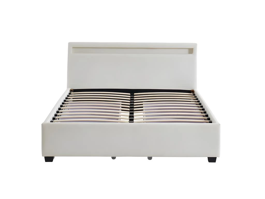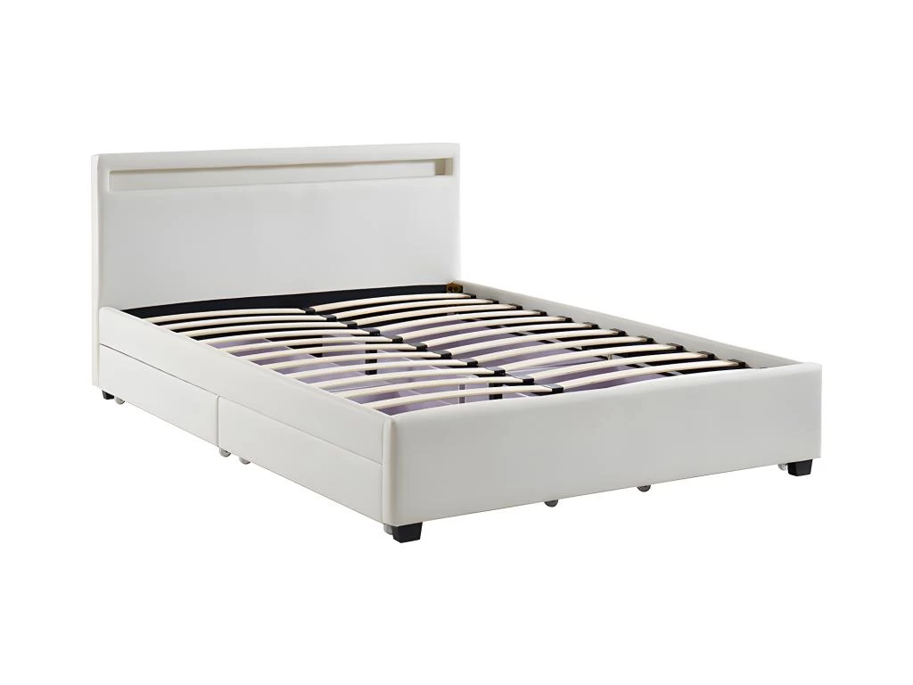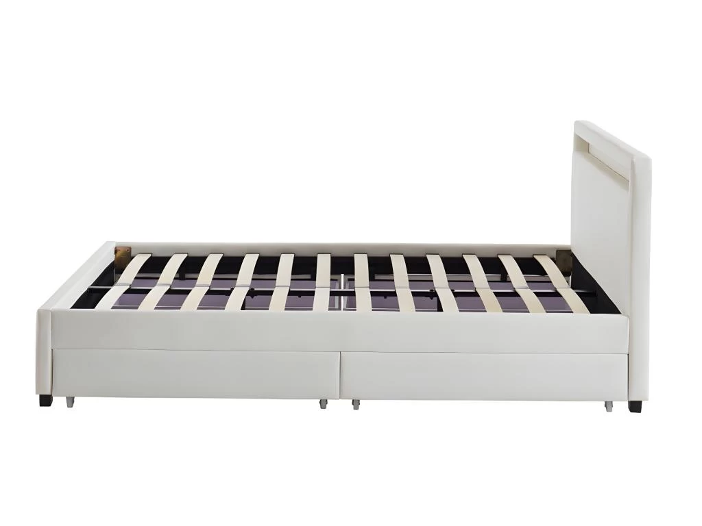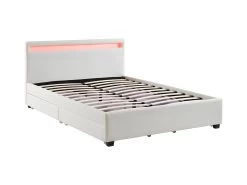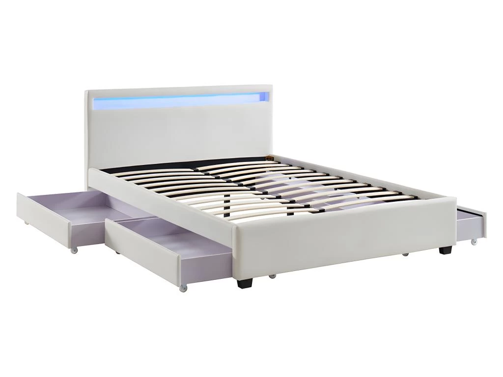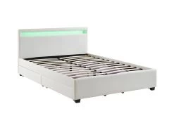 Particulièrement pratique, ce lit ALOIS II dispose de 4 grands tiroirs de rangement situĂ©s de chaque cĂ´tĂ© du lit. Son revĂŞtement en simili blanc et son éclairage Ă LEDs illumineront vos nuits.Â