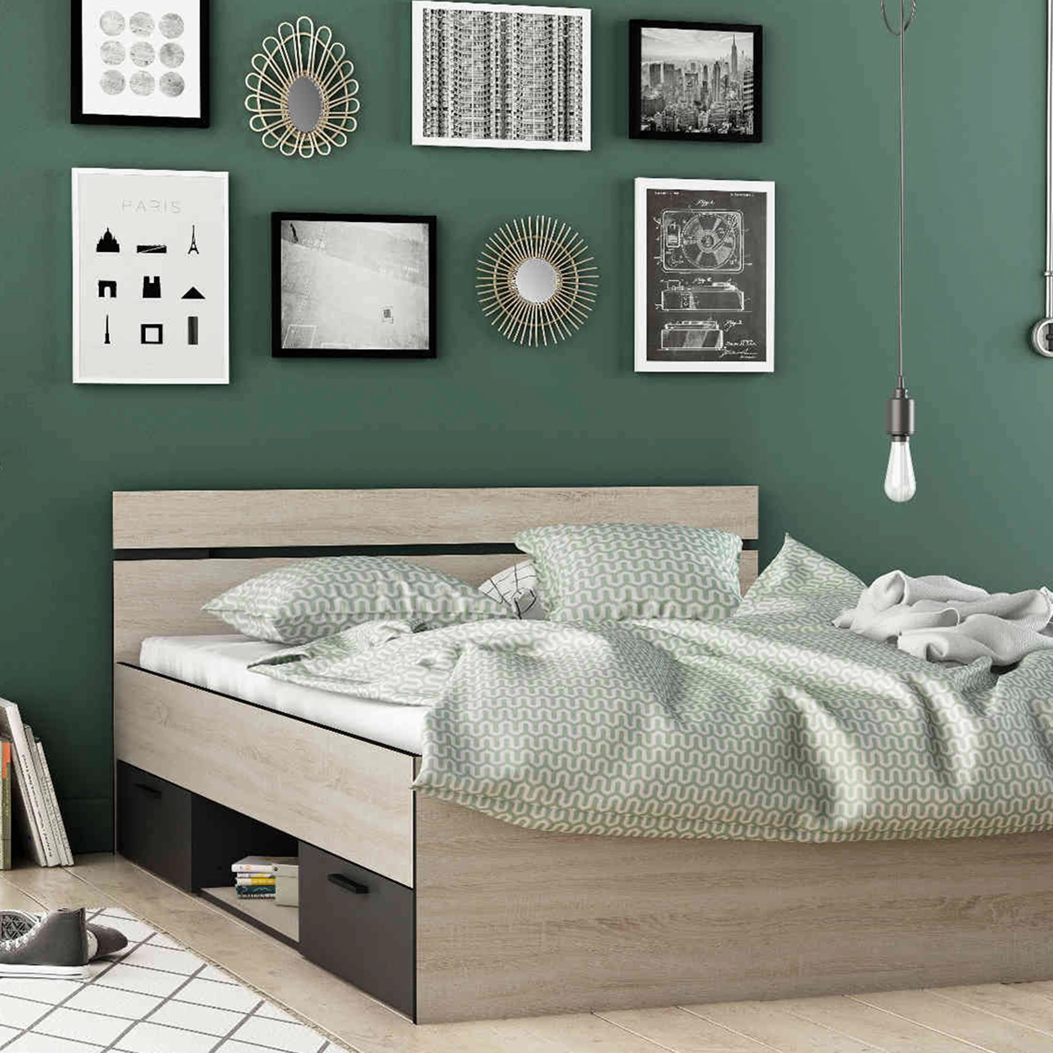 Lit 140×190 en bois chêne brossé et noir – LI171