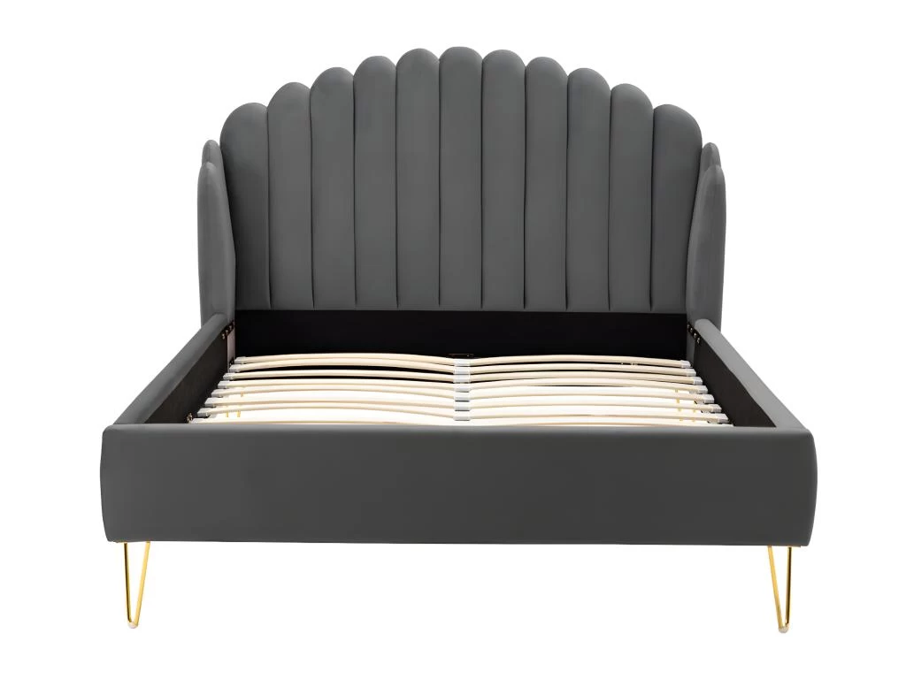 Apportez douceur et modernité à votre chambre grâce au lit SAGALI. Ses pieds en métal doré, sa structure en velours et sa tête de lit au charme romantique apporteront une touche vintage et unique à votre pièce.