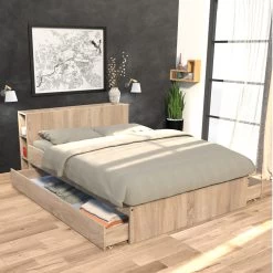 Lit 2 tiroirs avec tête de lit étagère en