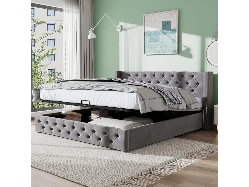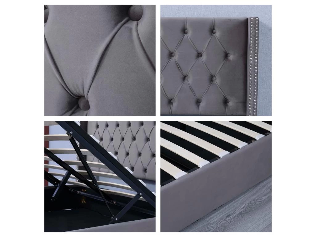 Avec les rivets dĂ©coratifs, les tissus en velours gris, la tĂŞte de lit Ă ailes et les surpiqĂ»res en lonsage, ce lit adulte 140×190 cm possède une apparence minimaliste mais Ă©lĂ©gante, il s’adapte parfaitement Ă Â votre chambre Ă Â coucher ou chambre d’ami.