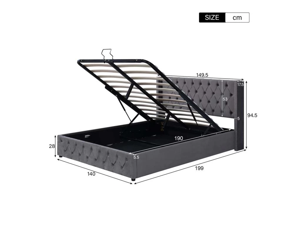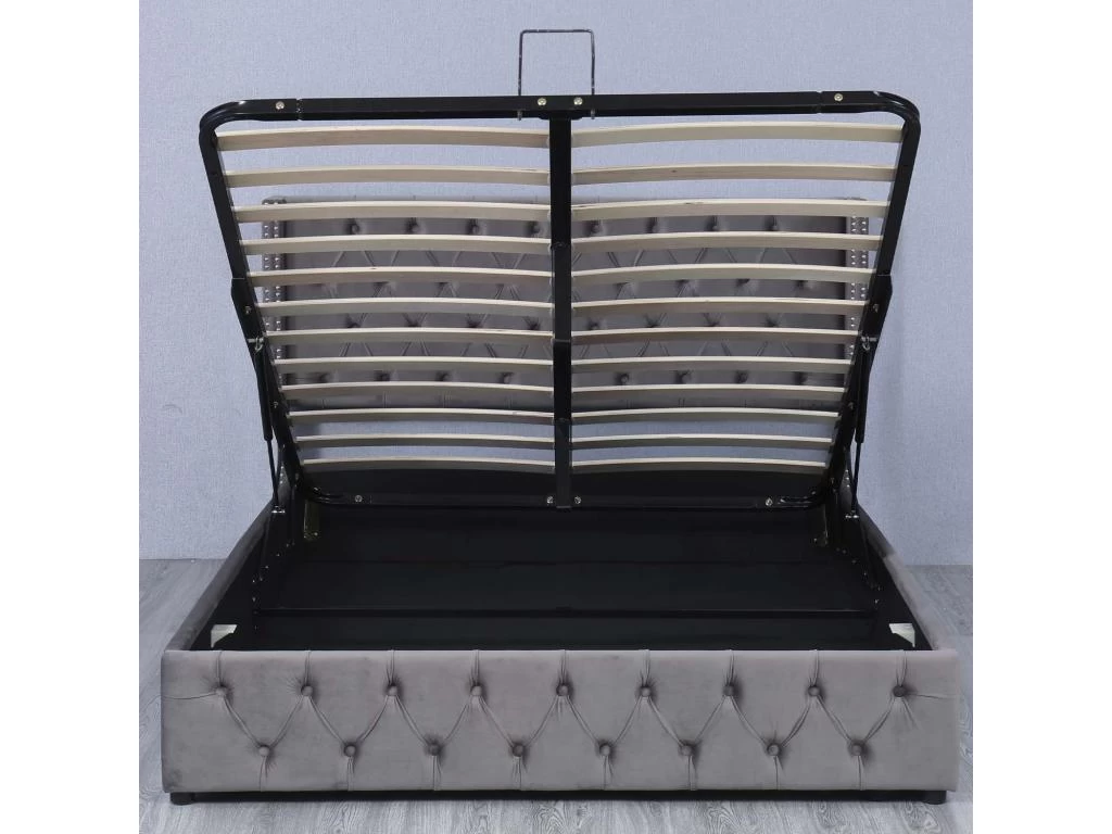 Grand espace sous le sommier à lattes relevable grâce à  la barre hydraulique vous permet d’y mettre des bagages ou des boîtes de rangement.