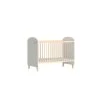 Lit bébé gris possédant une structure et un sommier en hêtre massif. Son sommier à lattes est réglable sur 3 hauteurs afin de rendre plus facile le coucher de bébé. Il est conditionné avec un sommier à lattes apparentes et est prévu pour accueillir un matelas bébé de taille 60×120 cm ou 70×140 cm (en option, vendu séparément).
