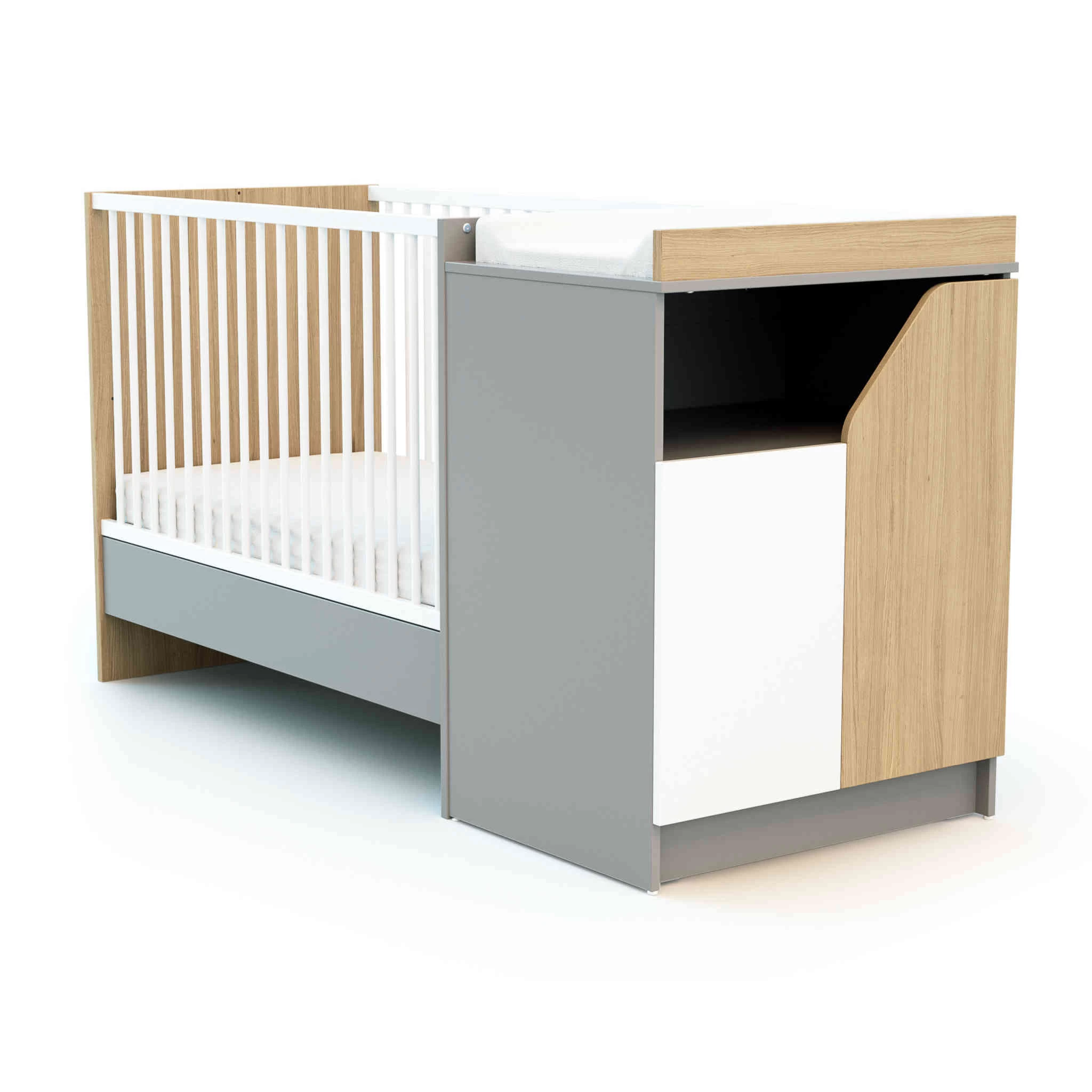 Lit bébé évolutif + meuble à langer en bois CARNAVAL, comprenant un lit bébé évolutif et un meuble à langer. Le lit bébé possède une structure et un sommier à lattes apparentes en hêtre massif. Ce lit bébé accompagnera votre bébé pendant de longues années pour de douces nuits. En effet, il est doté d’un sommier réglable sur 3 hauteurs et d’une structure évolutive lui permettant de se transformer en lit enfant lorsque votre enfant grandira. Ce lit bébé est prévu pour accueillir un matelas bébé de taille 60×120 cm (en option, vendu séparément).