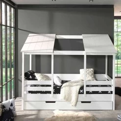 Lit cabane enfant avec toit en bois blanc 90×200 + tiroir de