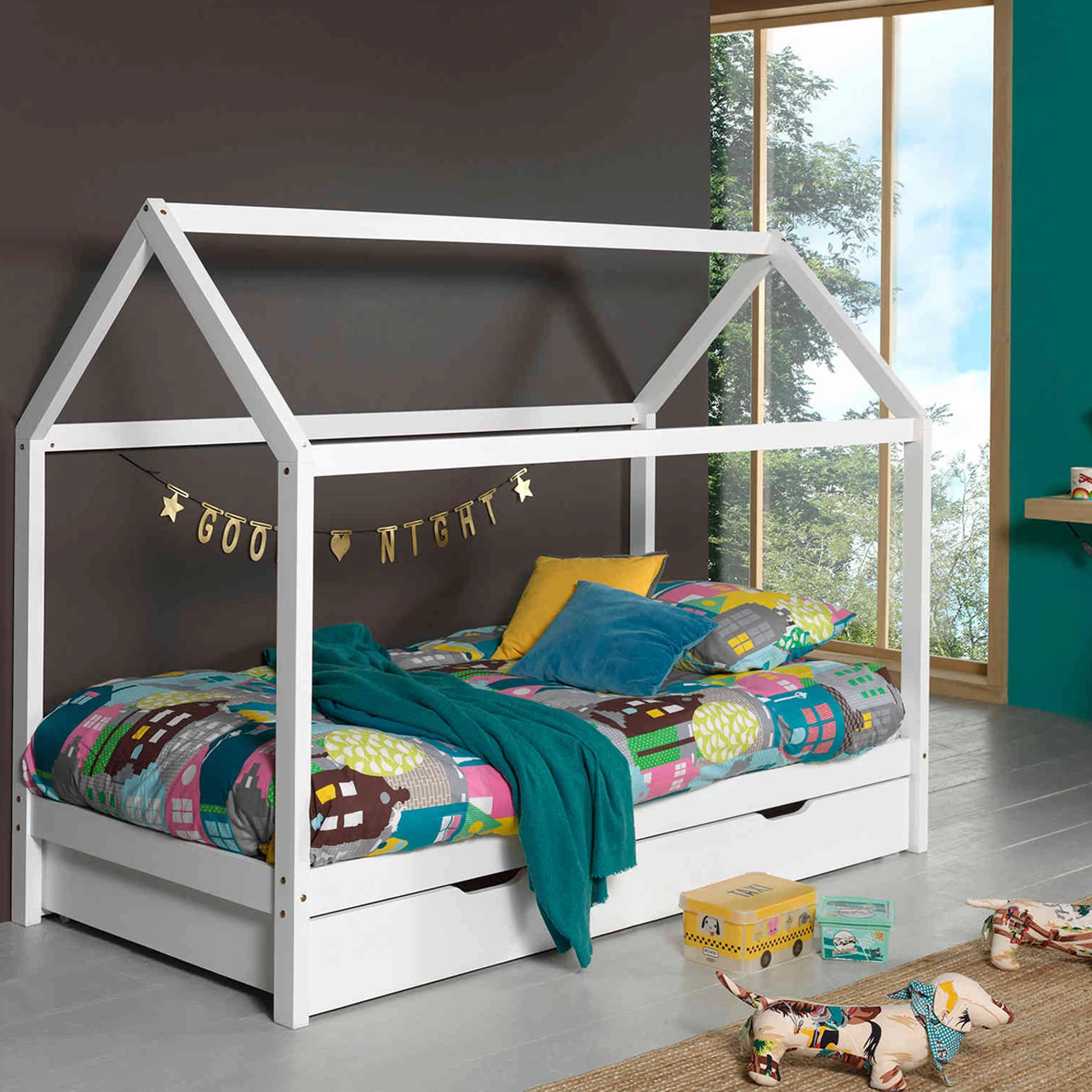 Lit cabane enfant en bois massif 90×200 avec tiroir de lit –