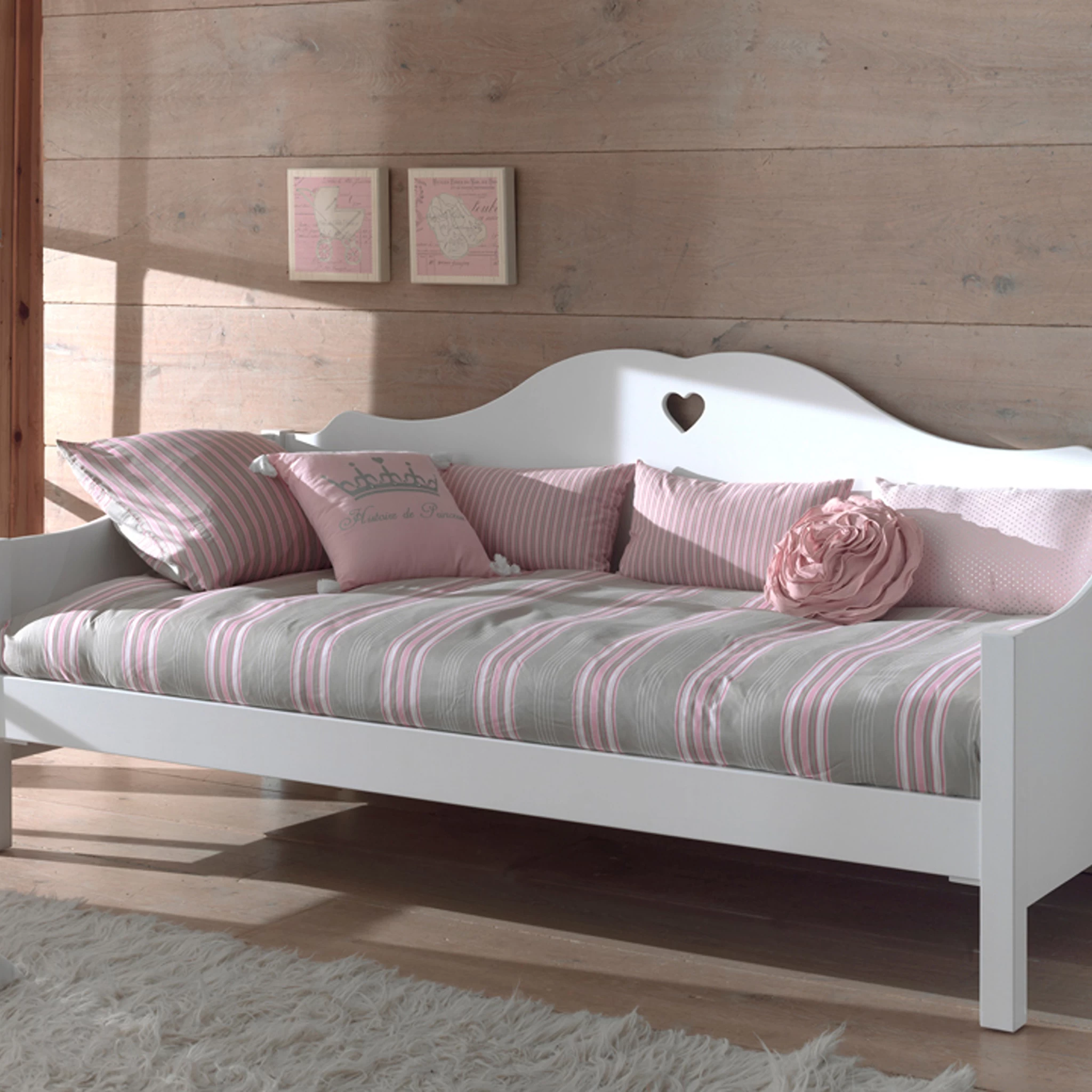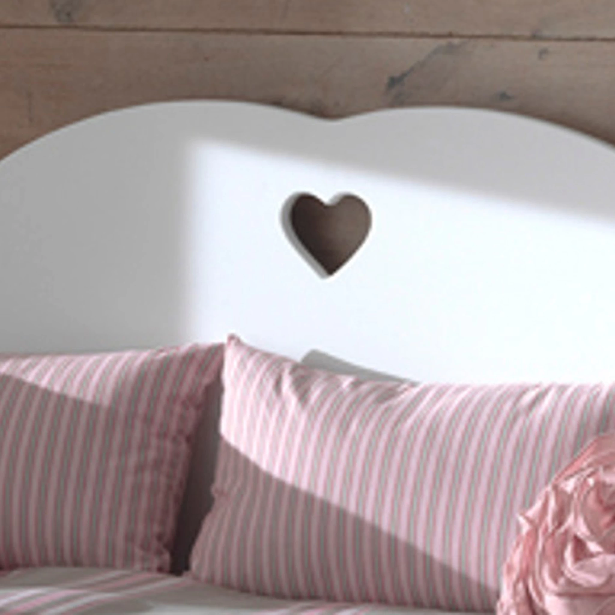 Lit CanapĂ© Enfant 90×200 composĂ© de bois MDF laquĂ© blanc. La tĂȘte de lit d’une hauteur de 75 cm est arrondie et dispose d’une sculpture dĂ©corative en forme de cĆur. IdĂ©al pour les petites filles. Ce lit Ă la particularitĂ© de servir de couchage la nuit et de banquette le jour. C’est le lit idĂ©al pour une chambre d’enfant ou d’ado. Des inserts mĂ©talliques disposĂ©s aux angles permettent l’accueil d’un cadre Ă lattes (le matelas et le cadre Ă lattes sont tous les deux en option, non inclus). Ne convient pas aux enfants de moins de 3 ans. Meuble livrĂ© en kit.