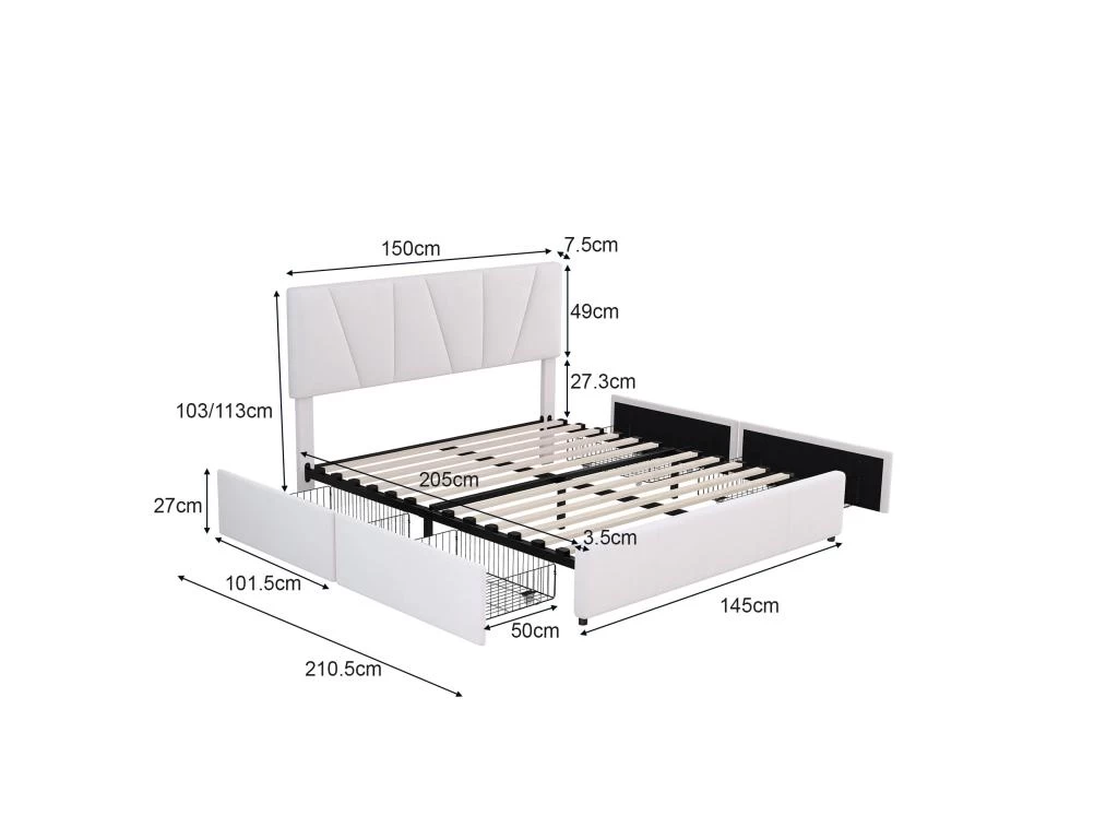 - Dimensions du lit : 208 x 150,5 x 117,5 – 123 cm