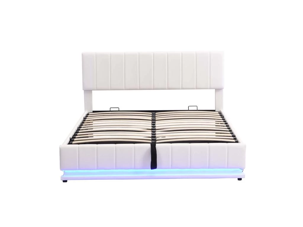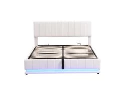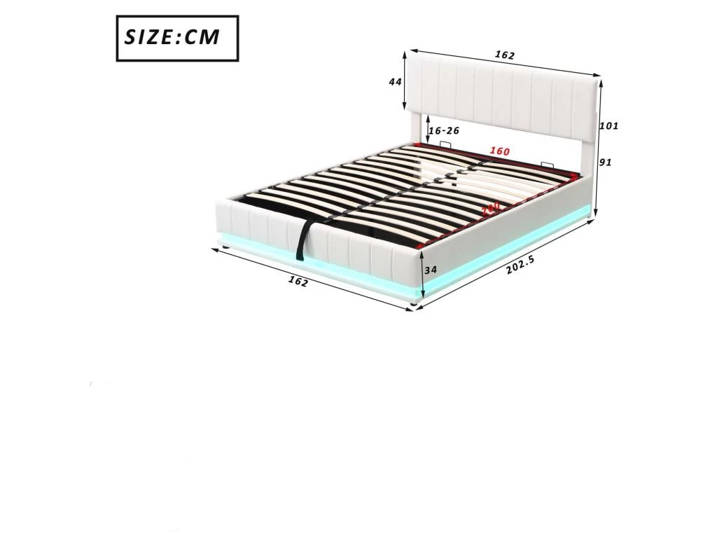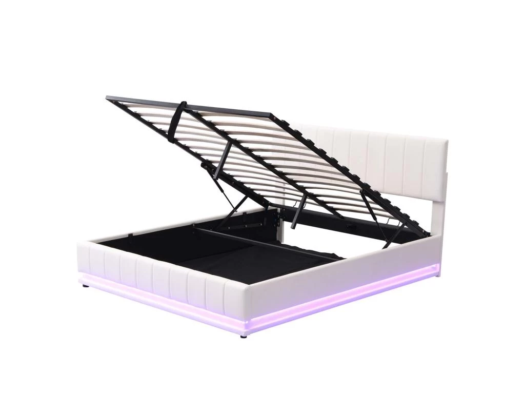 Grand espace sous le sommier à lattes relevable grâce à la barre hydraulique vous permet d’y mettre des bagages ou des boîtes de rangement.