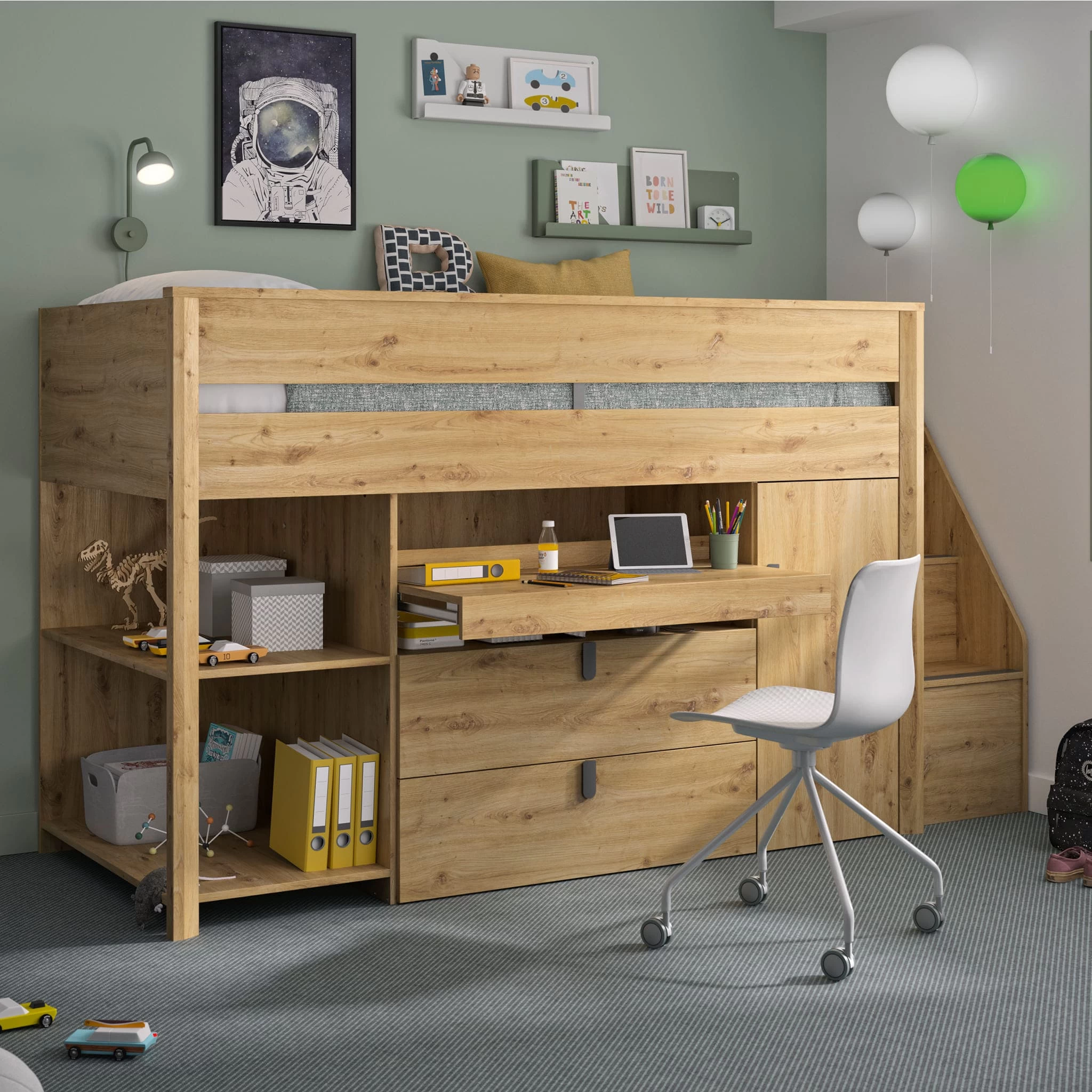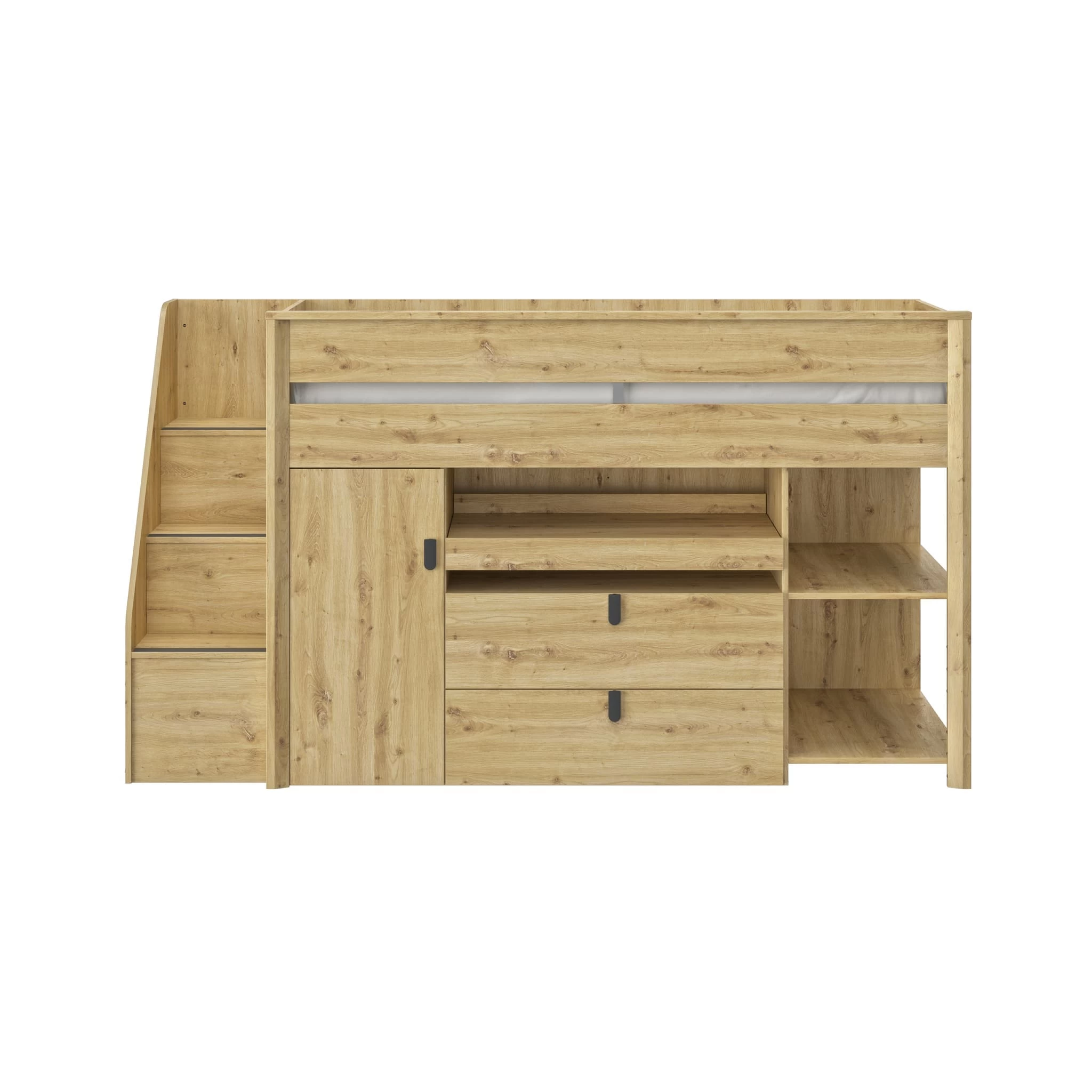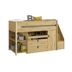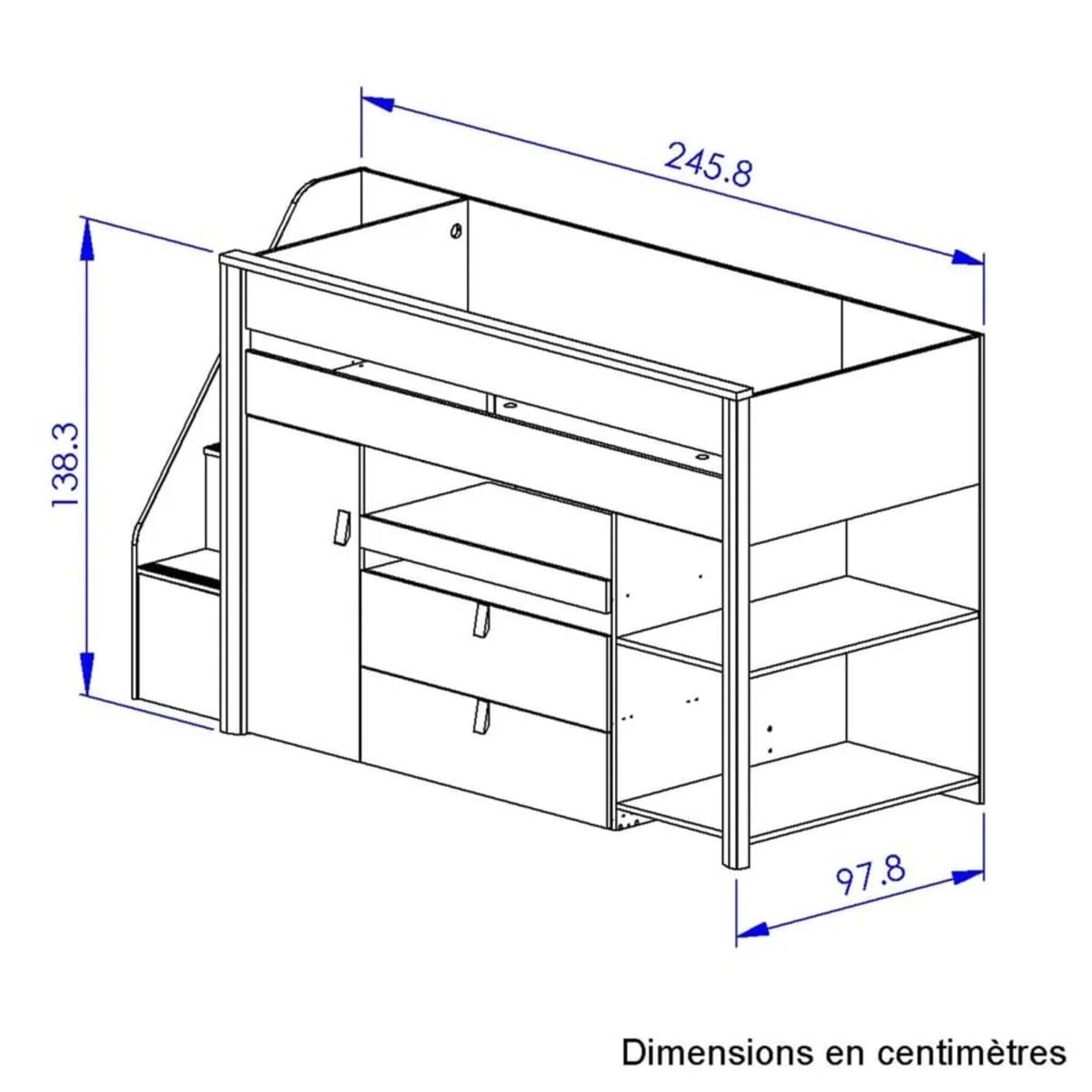 Ce lit en bois est un atout idĂ©al pour sublimer et amĂ©nager la chambre de votre enfant. En effet, son style classique et son aspect compact, lui permettent de s’adapter parfaitement Ă la chambre. Il comprend en effet de nombreuses fonctions offrant Ă votre enfant un meuble esthĂ©tique et pratique. Il possède un sommier en panneau perforĂ© pouvant accueillir un couchage en 90×200 cm. 3 marches anti-dĂ©rapantes vous permettront d’y accĂ©der facilement. Sa structure en panneaux de particules avec imitation chĂŞne artisan garantit une structure solide. De plus, il est de fabrication française garantissant des finitions de qualitĂ©. Il est aussi Ă©quipĂ© d’un plan de travail (Longueur 97 cm, Profondeur 60 cm), pouvant servir de bureau. Pour le rangement, il comprend 2 tiroirs (93,8cm x 38,9cm x 12,6cm de hauteur) avec poignĂ©es ainsi qu’une armoirette Ă©quipĂ©e d’une porte avec poignĂ©e et d’un tube de penderie (48,2cm x 59,6cm x 95,2cm de hauteur). Sur le cĂ´tĂ© du lit, 2 niches de rangement (91cm x 52,1cm x 46,1cm de hauteur) sont prĂ©sentes. L’ensemble du lit est rĂ©vĂ©rsible au montage vous permettant de l’assembler dans le sens que vous souhaitez.