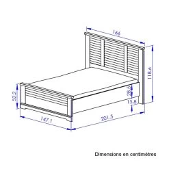 - Dimensions en 140×190 : Largeur 147,1 cm, Longueur 201,5 cm, Hauteur 118,6 cm. Poids : 50 kg