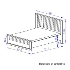 - Dimensions en 160×200 : Largeur 167,1 cm, Longueur 211,5 cm, Hauteur 118,6 cm. Poids : 56 kg