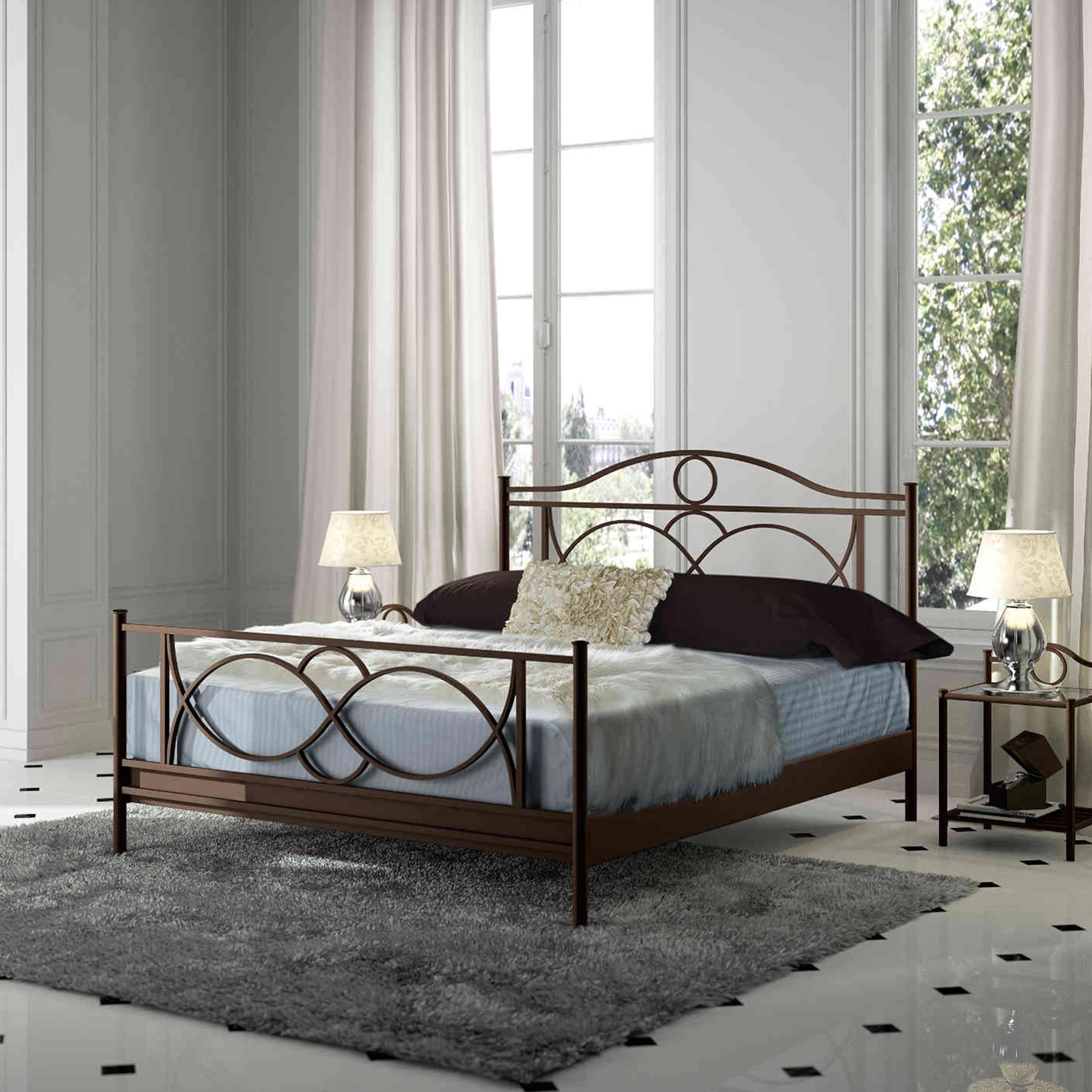 des dĂ©corations mĂ©talliques sur la tĂȘte et le pied de lit,