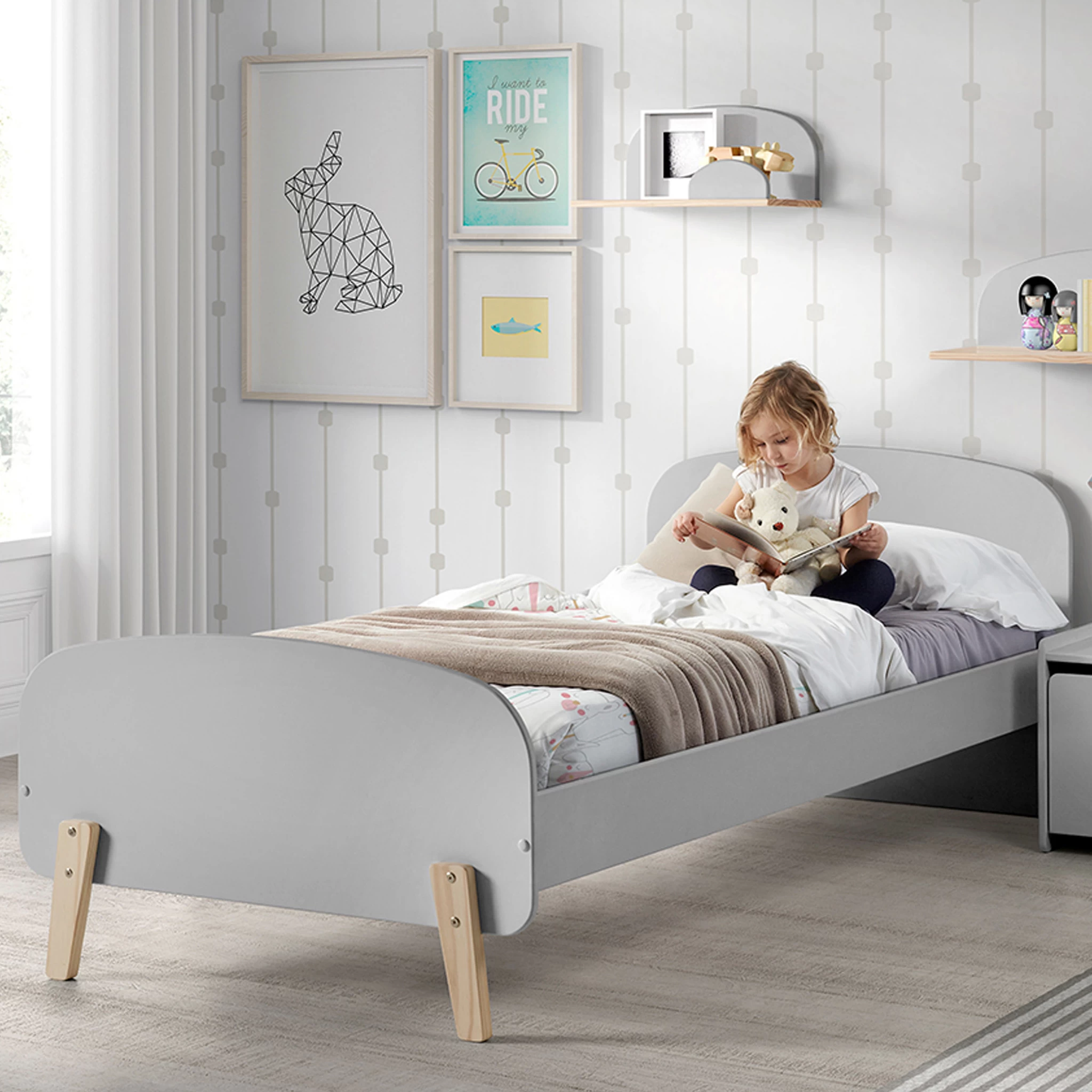 Lit 90×200 enfant gris clair, en bois MDF. Il possĂšde deus pieds solides en pin de couleur bois naturel, une tĂȘte de lit ainsi qu’un pied de lit. Le sommier Ă lattes apparentes est fourni avec le lit. Ce lit contient des couleurs douces et lĂ©gĂšres et un style charmant grĂące Ă son arrondi. Tendance, ce lit apporte une ambiance scandinave Ă la dĂ©coration. Son coloris pĂąle se marie facilement avec tout les styles de chambres, il plaira Ă coup sĂ»r Ă votre enfant !