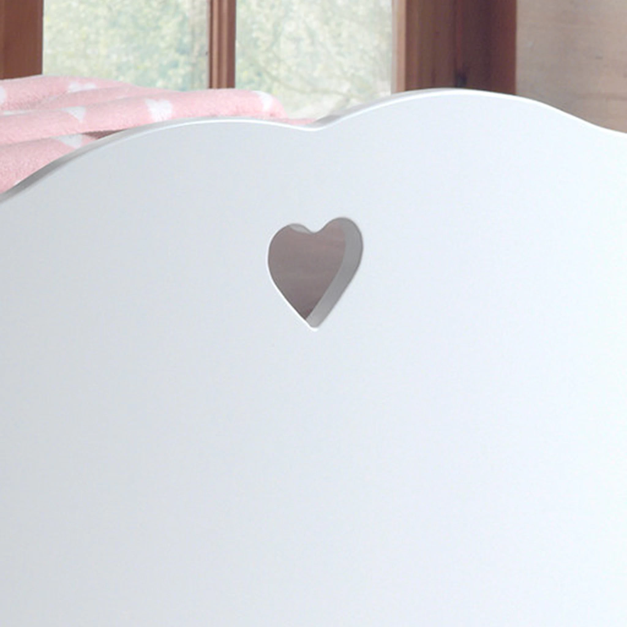 Lit Enfant Baldaquin 90×200 composĂ© de bois MDF laquĂ© blanc. Le lit est entourĂ© de barres pour baldaquin avec voilages blancs crĂ©ant une ambiance de style romantique, digne des contes de fĂ©es. La tĂȘte de lit d’une hauteur de 80 cm ainsi que le pied de lit sont arrondis et dispose d’une sculpture dĂ©corative en forme de cĆur. IdĂ©al pour les petites filles. Des inserts mĂ©talliques aux angles permettent l’accueil d’un cadre Ă lattes (le matelas et le cadre Ă lattes sont tous les deux en option, non inclus). Meuble livrĂ© en kit.