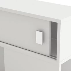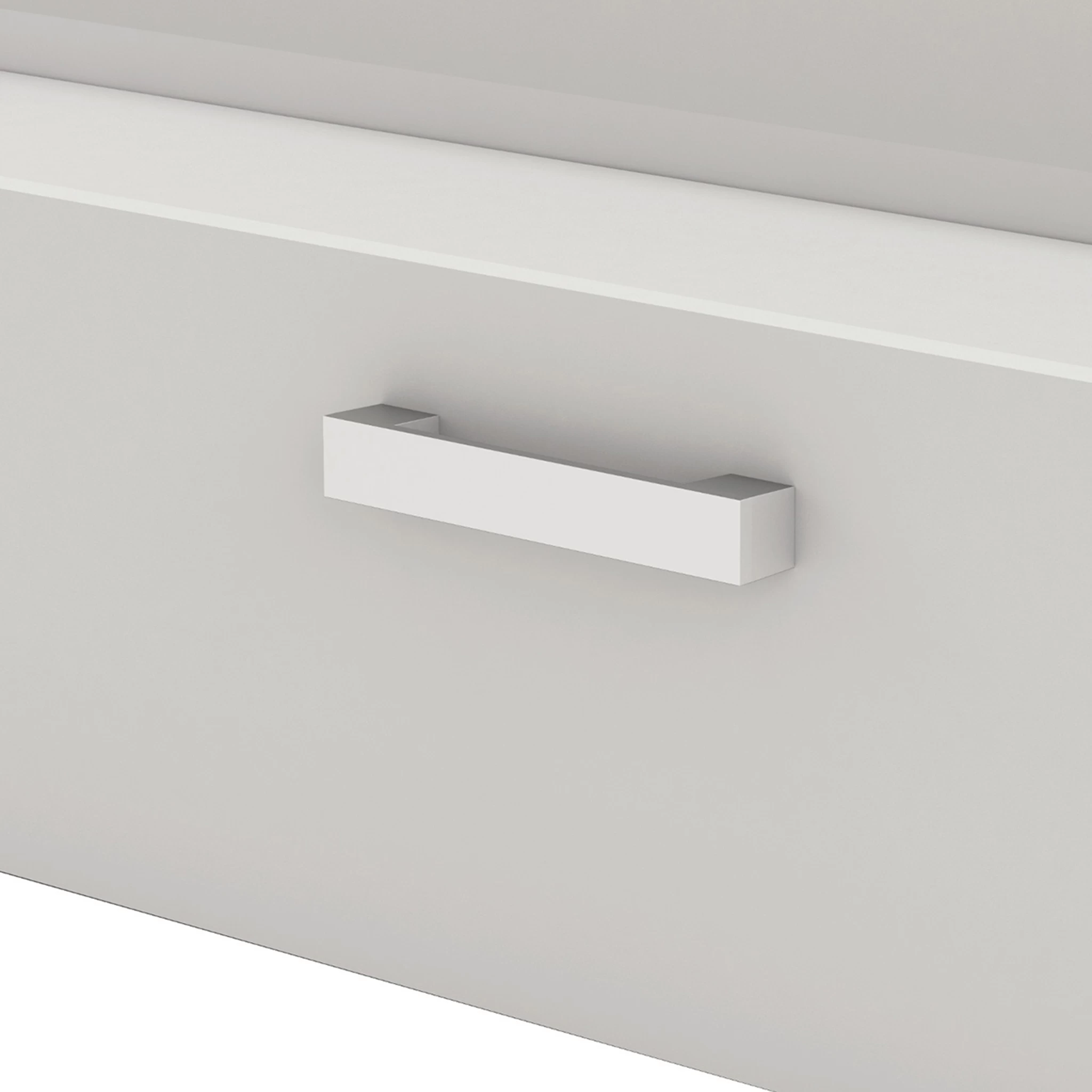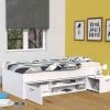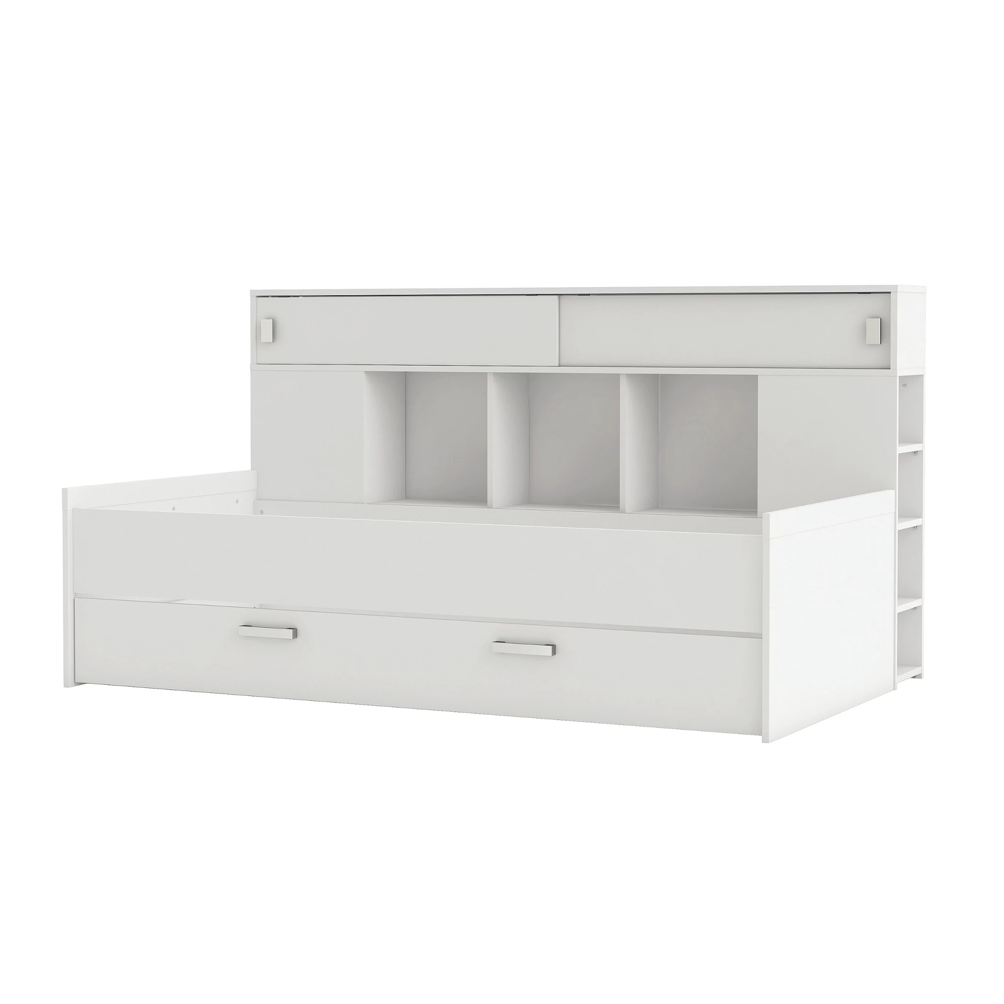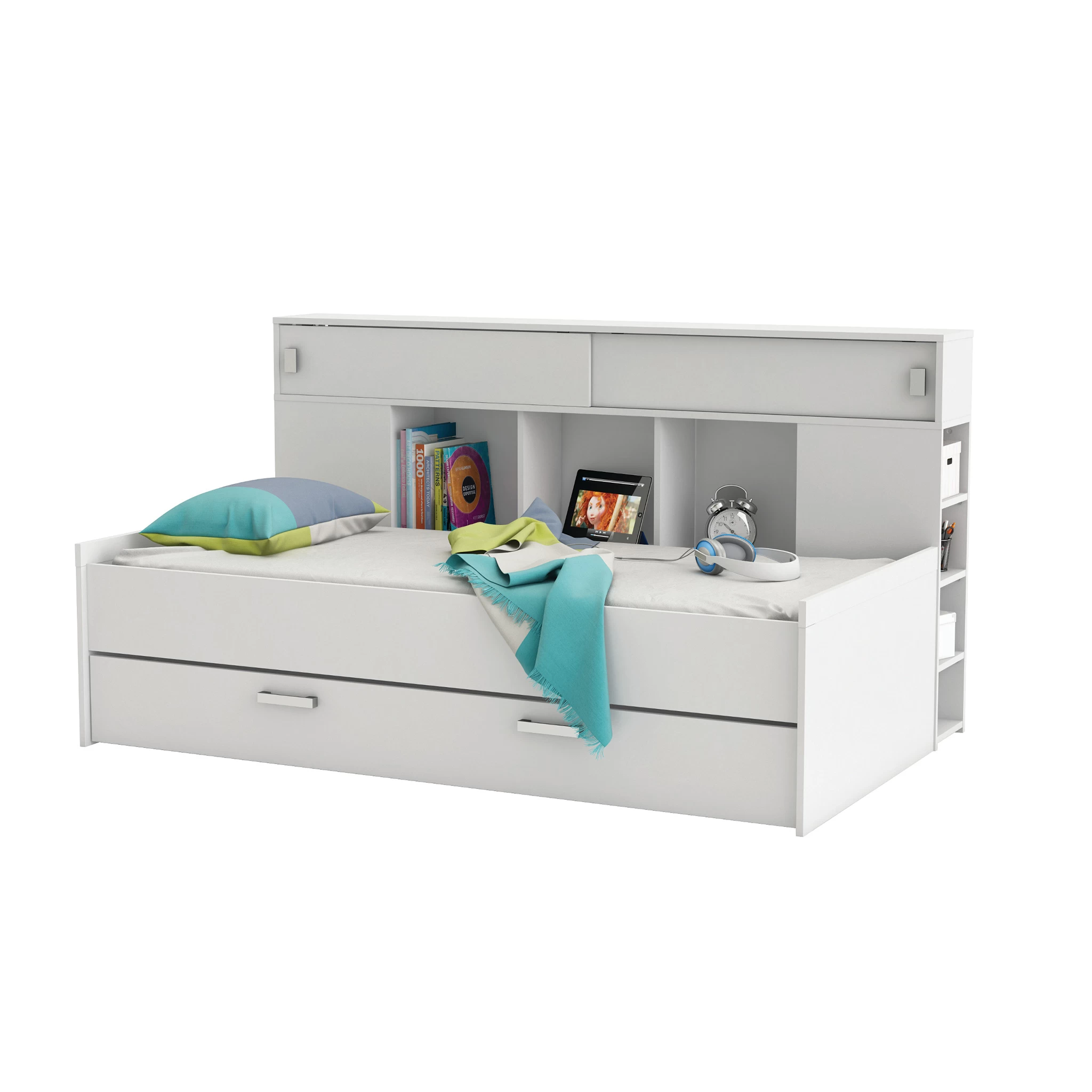 Lit Enfant Gigogne 90×200 en Bois MDF revĂȘtu d’un papier dĂ©cor imitation Blanc Perle. La structure comporte 4 Ă©querres d’angles afin de recevoir un cadre Ă lattes de taille 90×200 (sommier en option, non inclus). Ce lit comporte un tiroir de dimension 90×200 cm pouvant servir de second couchage en cas de visite imprĂ©vue. Son environnement de lit possĂšde de nombreux espaces de rangements : 2 portes coulissantes renfermant des niches de dimensions 92x21x22 cm, 3 niches centrales de dimensions 41x40x26 cm ainsi que 4 niches latĂ©rales. Les poignĂ©es des portes et tiroir sont en plastique rectangulaire. Lit ne convenant pas aux enfants de moins de 6 ans.