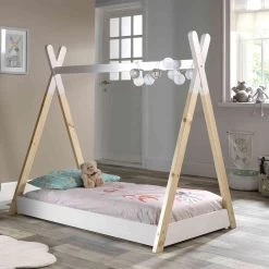 Original grĂące Ă sa forme de tipi, il  emporte votre enfant chaque nuit au pays des Indiens. Ce lit au design trĂš0s doux est idĂ©al pour que votre enfant se crĂ©e un monde qui lui appartient, se raconte des histoires en tous genres en laissant place Ă son imagination, s’amuse avec ses petits camarades dans son lit cabane prĂ©fĂ©rĂ©. Ses barreaux sont en couleur chĂȘne naturel pour apporter un contraste au blanc et apporter une touche de dĂ©coration supplĂ©mentaire dans la chambre de votre enfant.