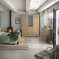 Une belle armoire avec miroir. Elle possède 3 portes dont 2 avec poignĂ©es renfermant 5 Ă©tagères et 1 barre de penderie permettant d’optimiser le rangement dans votre chambre. Elle vous offre donc 6 espaces de rangement et une penderie (1m20 x 44cm x 1m60 de hauteur). Les niches sont de dimensions 59,4cm x 44,4cm x 40cm de hauteur. Et la niche de la penderie est de dimensions 1m20 x 44cm x 31,5cm de hauteur. Cela vous permettra de ranger toutes vos affaires ou votre linge de lit comme vous le souhaitez. La porte centrale possède un miroir pour faciliter vos essayages. Sa structure en panneaux de particules est montĂ©e sur socle. Celle ci est couverte de papier dĂ©cor ce qui lui donne cet effet châtaignier et un style soignĂ©.