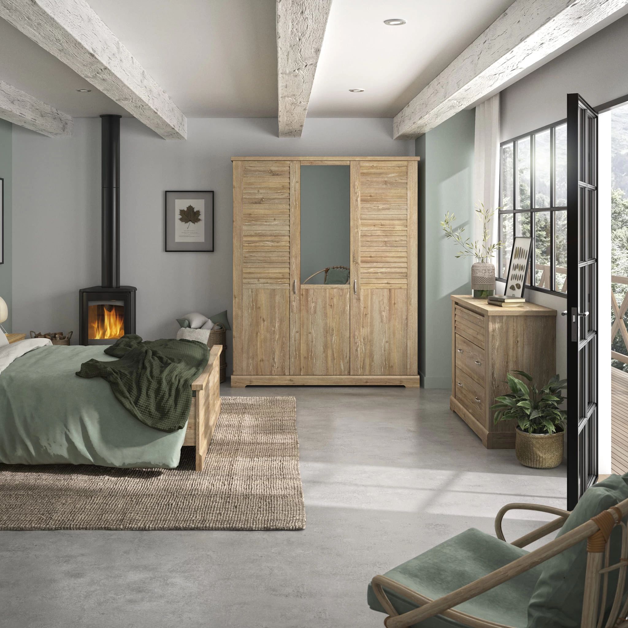 Un lit en bois avec sa jolie tête de lit qui apporte style et confort. Sa structure en panneaux de particules revêtues de papier imitation persienne garantit une structure solide. Le tout avec une imitation châtaignier cérusé ce qui lui apporte ce style tendance pouvant rappeler le bord de mer.