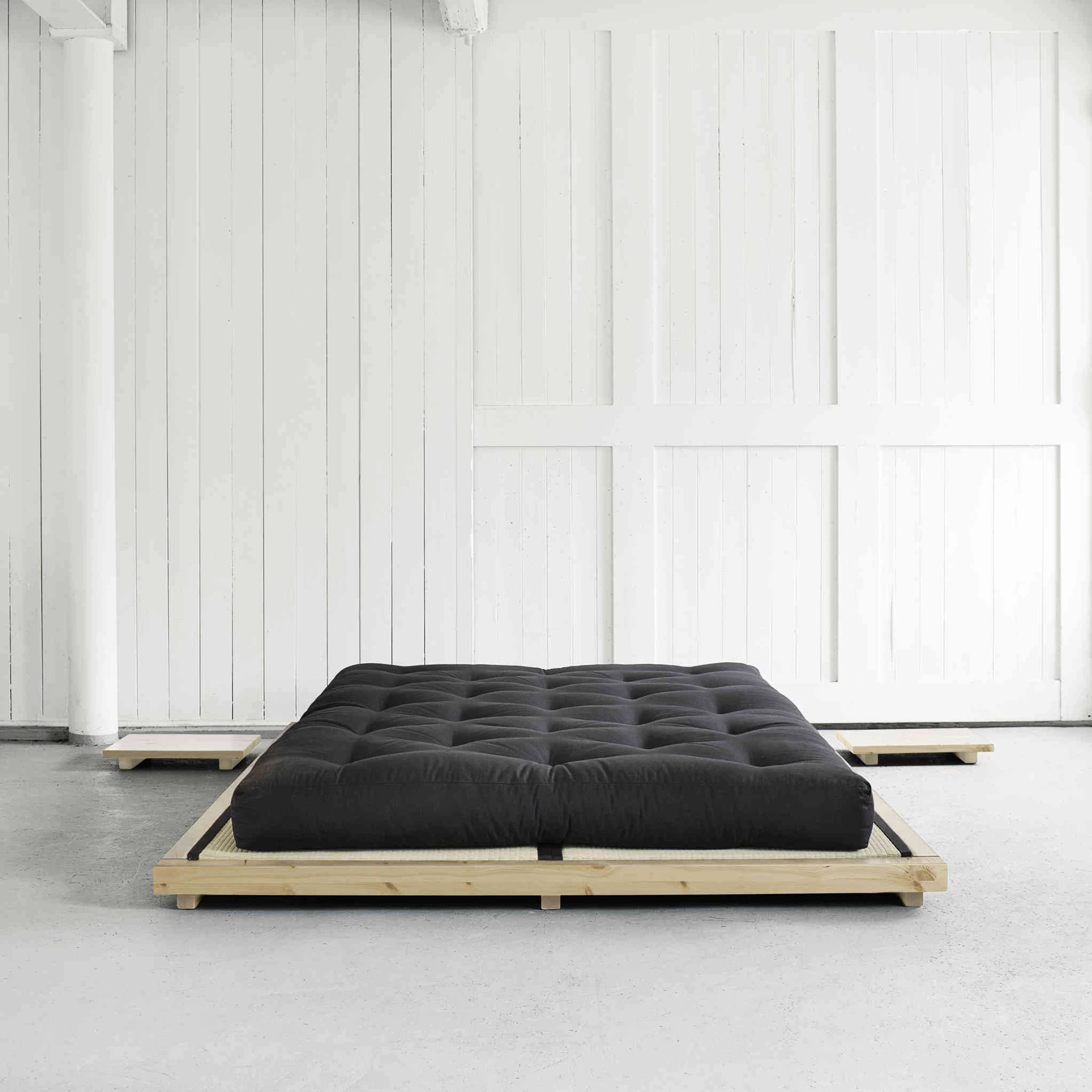 Lit pour matelas futon en bois massif coloris naturel. Ce lit au style japonais est composĂ© d’un cadre en bois de pin massif. Il apporte une rĂ©elle touche dâoriginalitĂ© tout en s’adaptant Ă votre style de chambre. Ce lit deux places est vendu avec un sommier Ă lattes (environ 7 cm d’espacement entre les lattes) et est prĂ©vu pour accueillir un matelas futon en 160×200 et 180×200 (vendu sĂ©parĂ©ment). ĂlĂ©gant et simple, ce lit imitation tatami saura s’adapter Ă diffĂ©rentes utilisations comme en couchage de tous les jours ou encore d’appoint pour recevoir des amis.Â