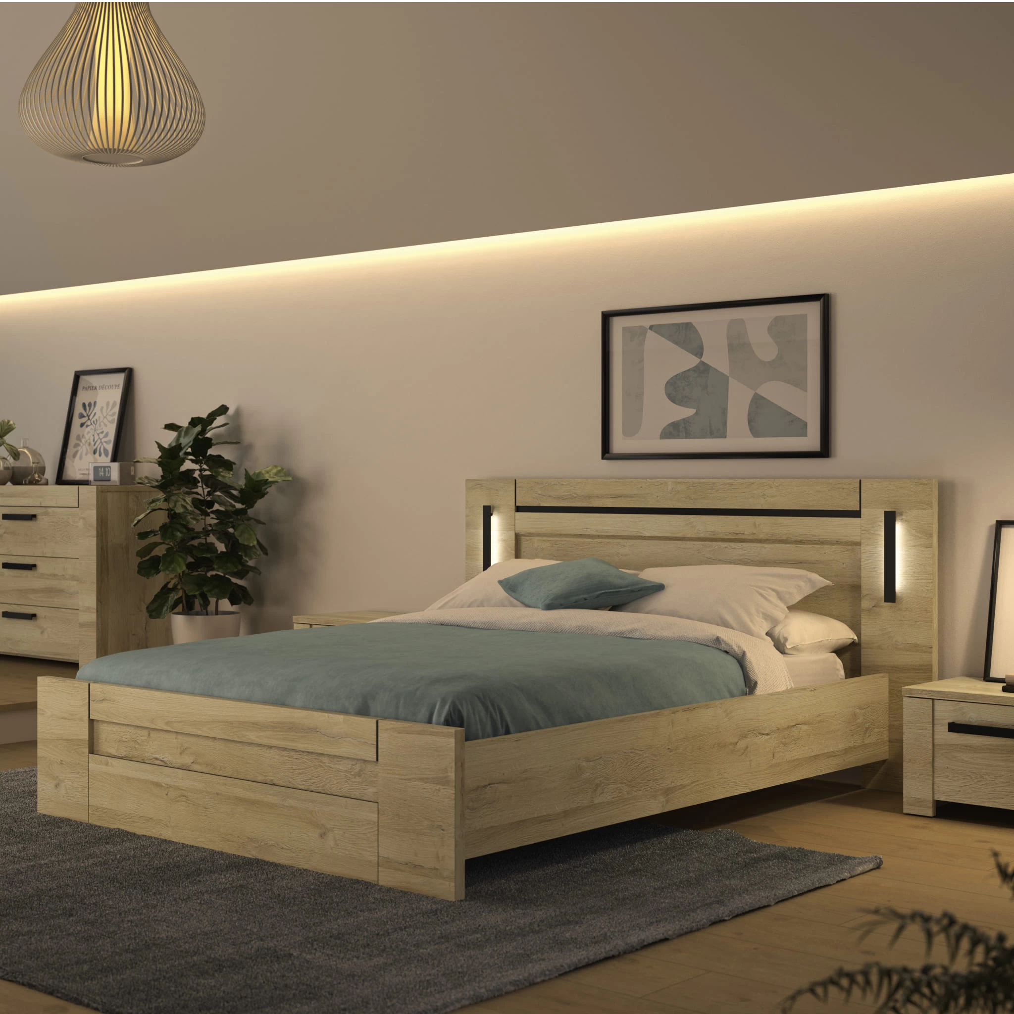 Un lit en bois, idĂ©al pour sublimer et amĂ©nager votre chambre. Il possède une jolie tĂŞte de lit qui apporte style et confort. Celle-ci comprend 2 Ă©clairages liseuses rectangles tactiles vous offrant une lumière tamisĂ©e. Ils sont simples d’utilisation pusqu’il suffit de toucher la partie mĂ©tallique pour rĂ©gler la luminositĂ© (4 niveaux d’intensitĂ©). Sa structure en panneaux de particules garantit une structure solide, de plus il est de fabrication française garantissant des finitions de qualitĂ©. Le tout avec une finition chĂŞne dorĂ© agrĂ©mentĂ©e de noir, ce qui lui apporte ce style moderne et Ă©lĂ©gant.
