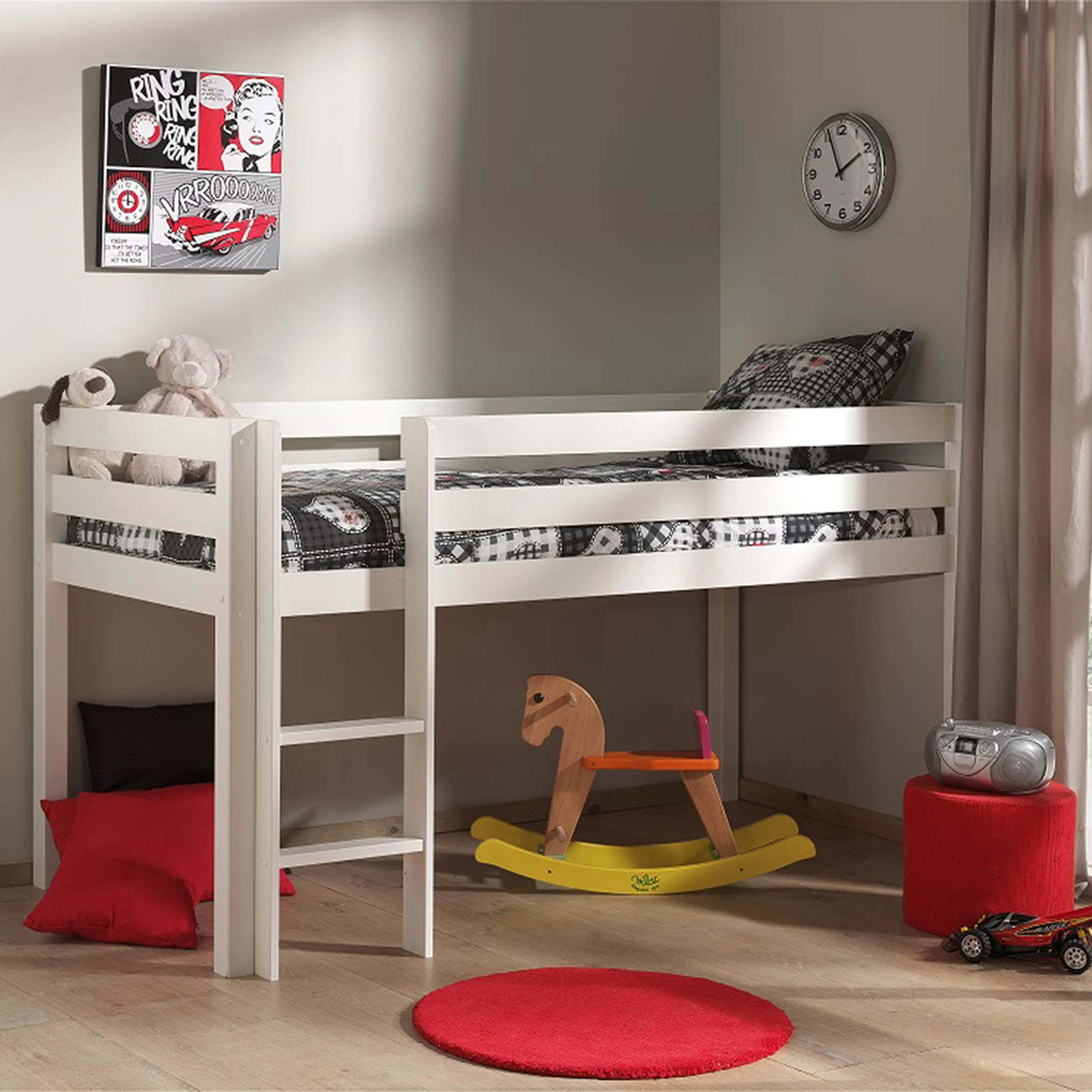 Lit Mezzanine 90×200 constituĂ© de pin massif de couleur Blanc LaquĂ©. Il est prĂ©vu pour accueillir un couchage 90×200, le sommier Ă lattes est inclus en revanche le matelas est en option, vendu sĂ©parĂ©ment. Nous vous conseillons un matelas dĂ©paisseur 20 cm maximale. GrĂące Ă sa hauteur, ce lit mezzanine permettra de faciliter le rangement de la chambre de votre enfant en plaçant en dessous de celui-ci ses coffres de rangement, ses caisses de jouet, … L’Ă©chelle permet Ă votre enfant d’accĂ©der Ă la partie supĂ©rieure du lit. Elle est composĂ©e de 2 marches plates et ses arrĂȘtes sont arrondies. La hauteur entre le sol et le sommier est de 75,5 cm.