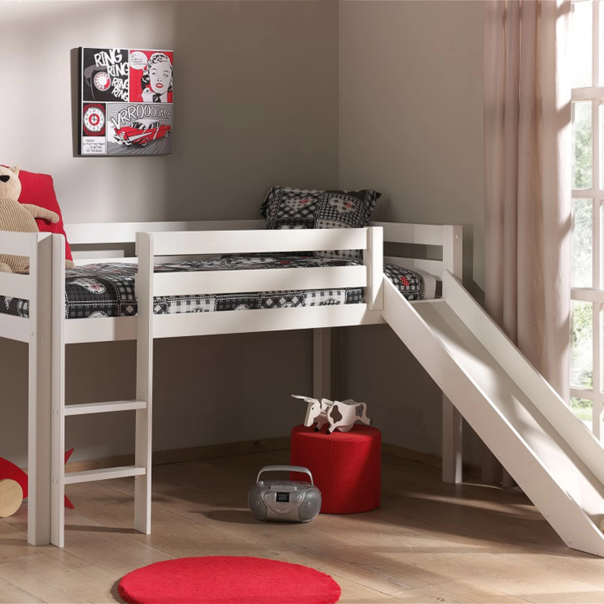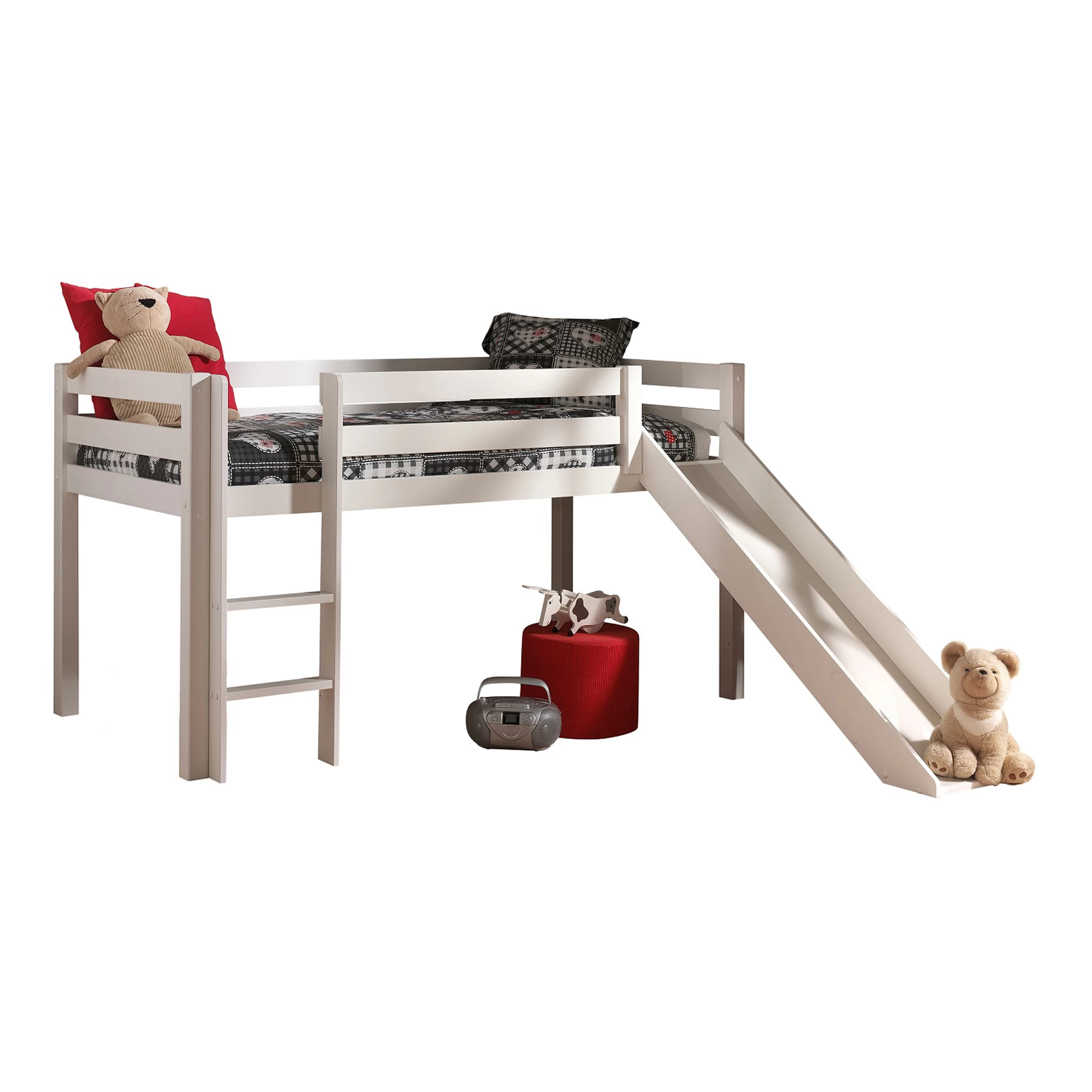 Lit Mezzanine 90×200 constituĂ© de pin massif de couleur blanc laquĂ© et comportant un toboggan, ce qui fera le bonheur de votre enfant. Il est prĂ©vu pour accueillir un couchage 90×200, le sommier Ă lattes est inclus en revanche le matelas est en option, vendu sĂ©parĂ©ment. La hauteur entre le sol et le sommier est de 75,5 cm.