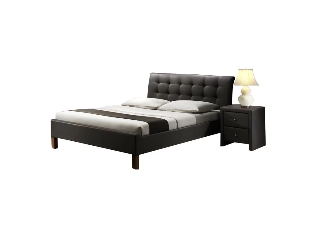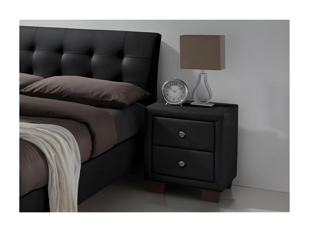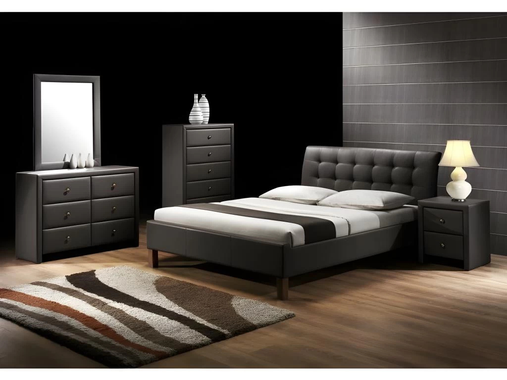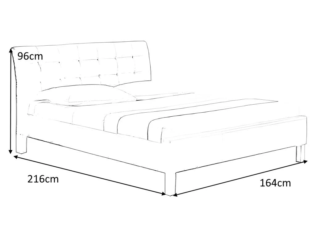 Personne ne manquera de place ! Avec sa largeur totale de 163 cm et sa longueur totale de 216 cm vous pourrez dormir dans le plus grand confort possible. Par ailleurs sa tête de lit rembourrée vous offrira une assise agréable. Choisissez un design moderne. Le revêtement de ce lit en cuir synthétique donnera à votre pièce du cachet. De plus, son coloris sombre apportera à votre chambre une ambiance enveloppante et feutrée. Optez pour la qualité ! Vous pouvez compter sur son revêtement en cuir synthétique pour faire durer votre lit dans le temps. Cette matière robuste est aussi imperméable et stoppe l’humidité. Simple et rapide Le lit est à monter soi-même. Une notice de montage vous explique clairement toutes les étapes d’assemblage. Des accessoires de montage sont inclus. Matériau : Cuir synthétique (Revêtement) Dimensions et poids : Longueur : 216 cm Largeur : 163 cm Hauteur totale : 96 cm Poids : 47.60 kg Matelas non inclus – Sommier à lattes inclus
