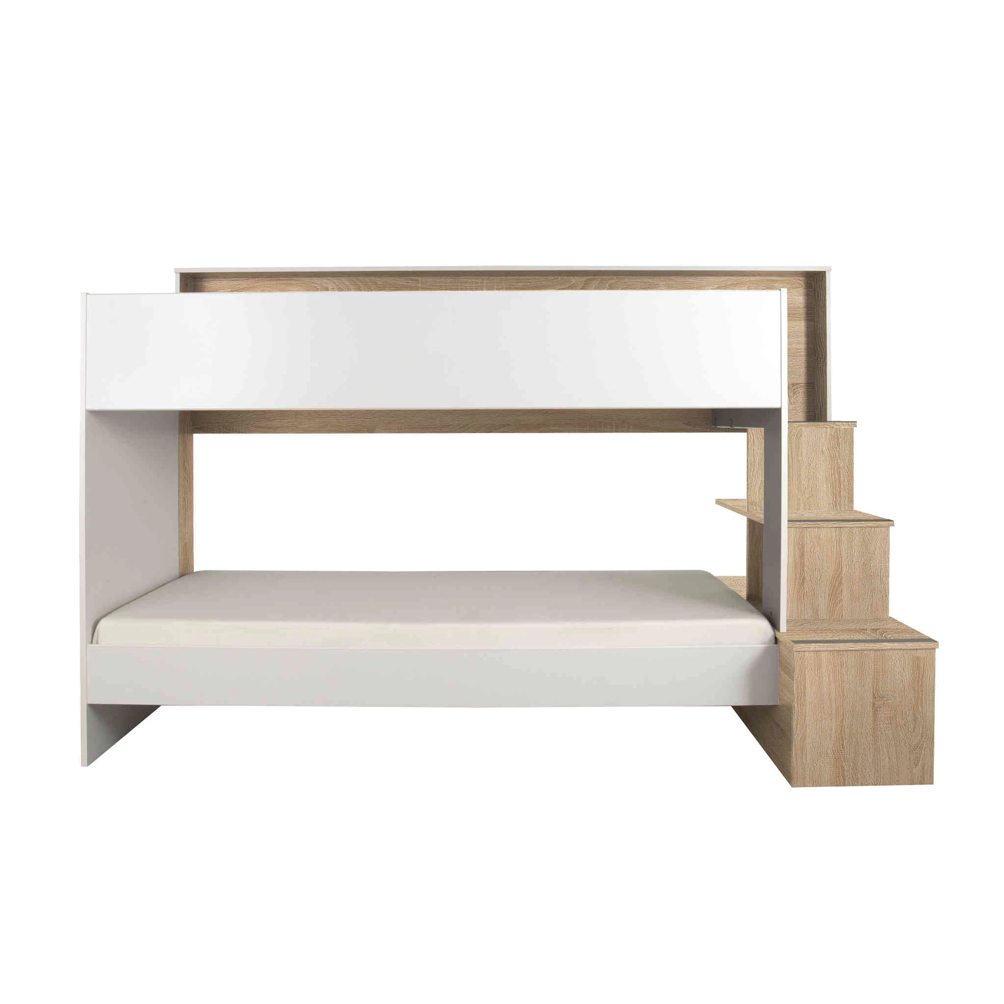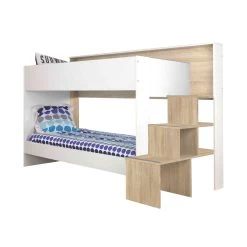 Lit superposé 90×200 en panneaux de particules revêtus d’un papier décor imitation chêne brossé et blanc. Il comporte deux sommiers 90×200 panneaux perforés pouvant accueillir deux matelas 90×200 (en option). Ce lit comporte un escalier avec bandes antidérapantes pour accéder au couchage supérieur en toute sécurité. Cet escalier a aussi une fonction niches afin d’optimiser le rangement dans la chambre de votre enfant. Enfin, le lit possède une bibliothèque, permettant à votre enfant d’y ranger ses livres préférés !
