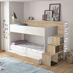 Lit superposé 90×200 en panneaux de particules revêtus d’un papier décor imitation chêne brossé et blanc. Il comporte deux sommiers 90×200 panneaux perforés pouvant accueillir deux matelas 90×200 (en option). Ce lit comporte un escalier avec bandes antidérapantes pour accéder au couchage supérieur en toute sécurité. Cet escalier a aussi une fonction niches et également un tiroir de lit permettant d’optimiser le rangement dans la chambre de votre enfant. Enfin, le lit possède une bibliothèque, permettant à votre enfant d’y ranger ses livres préférés !