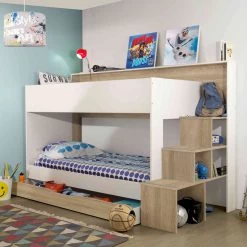 Lit superposé 90×200 en panneaux de particules revêtus d’un papier décor imitation chêne brossé et blanc. Il comporte deux sommiers 90×200 panneaux perforés pouvant accueillir deux matelas 90×200 (en option). Ce lit comporte un escalier avec bandes antidérapantes pour accéder au couchage supérieur en toute sécurité. Cet escalier a aussi une fonction niches et également un tiroir de lit permettant d’optimiser le rangement dans la chambre de votre enfant. Enfin, le lit possède une bibliothèque, permettant à votre enfant d’y ranger ses livres préférés !