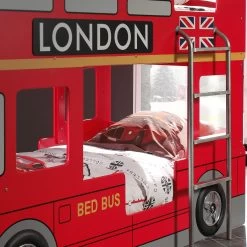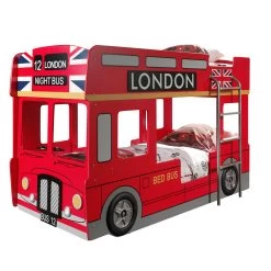 Lit SuperposĂ© London Bus 90×200 pour enfant constituĂ© de panneaux de particules revĂȘtus de papier dĂ©cor qui, sur la thĂ©matique de Londres, fera rĂȘver tous les fans de cette capitale. Ce lit possĂšde des panneaux de sĂ©curitĂ©s Ă©vitant les chutes durant la nuit. Il est prĂ©vu pour accueillir deux matelas de 90×200 (non fournis). Les sommiers sont composĂ©s de planches perforĂ©es pour une meilleure aĂ©ration. L’Ă©chelle pour accĂ©der Ă la partie couchage est composĂ©e de quatre marches. Tel un vĂ©ritable bus londonien, le drapeau est prĂ©sent sur la tĂȘte de lit et les cĂŽtĂ©s latĂ©raux, un volant est placĂ© au niveau du couchage infĂ©rieur pour que vos enfants puissent s’amuser et conduire leur bus prĂ©fĂ©rĂ© dans leur nouvel espace.