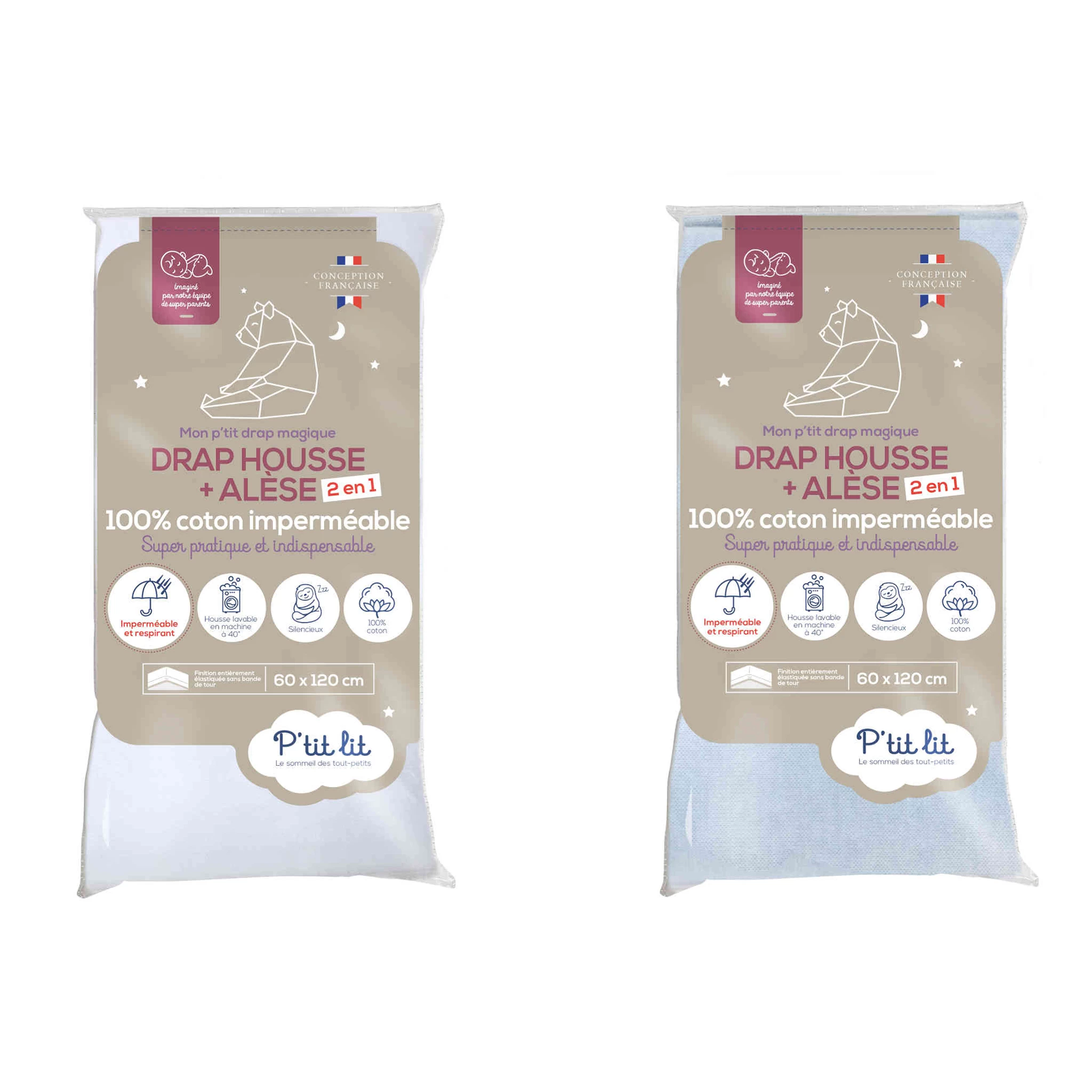 Ce lot de 2 draps housses bébé + alèses de la marque P’tit