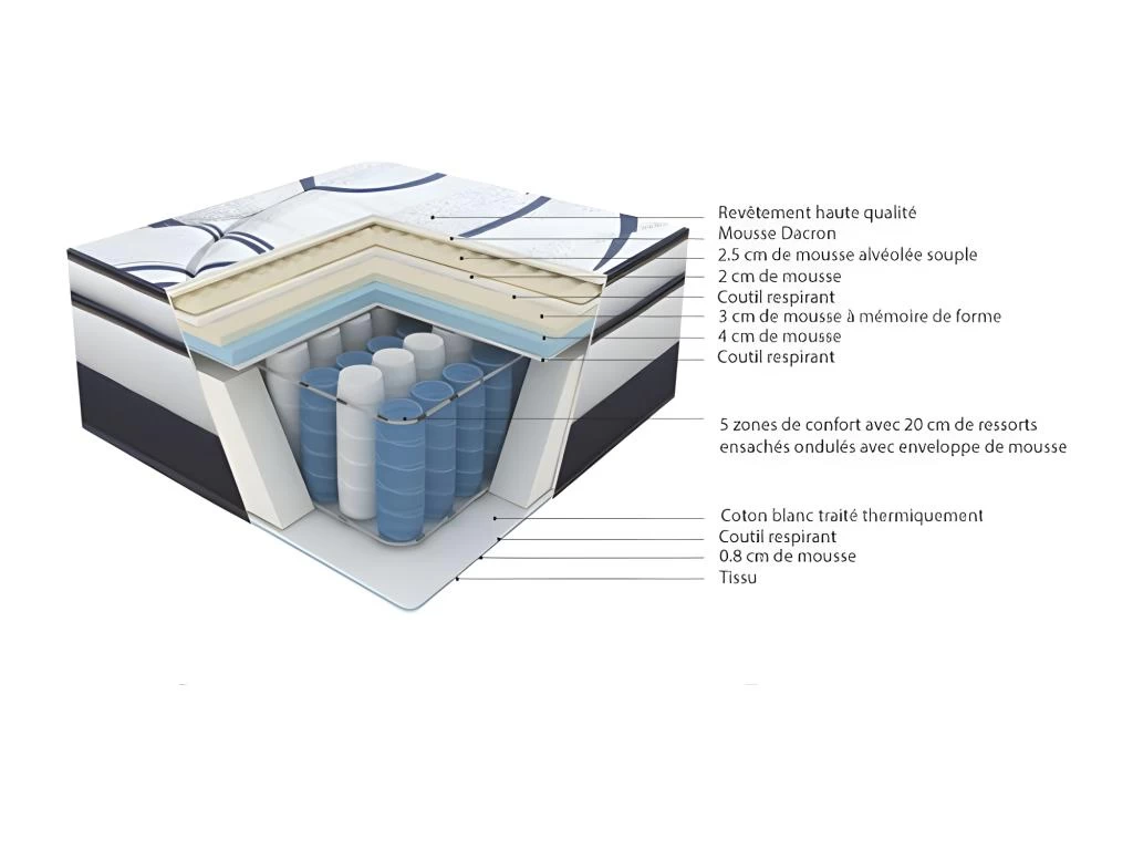 - Ressorts ensachés avec 7 zones de confort et ceinture latérale de maintien