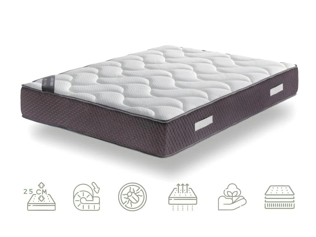 - Matelas de 25 cm de hauteur avec couche à mémoire de forme de 4 cm avec une densité de 55kg/m3.