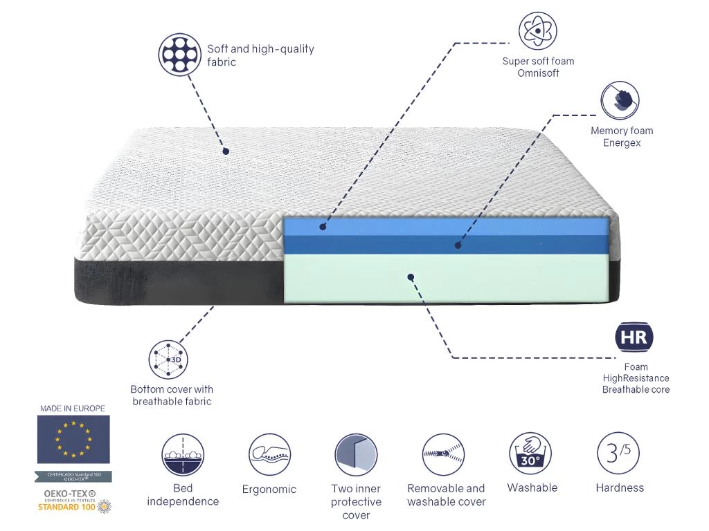 Matelas 150X190 COSMO, Epaisseur 25 CM, Dehoussable, Ergonomique, Hybride Et Respirant. Fermeté 3/5 Moyenne