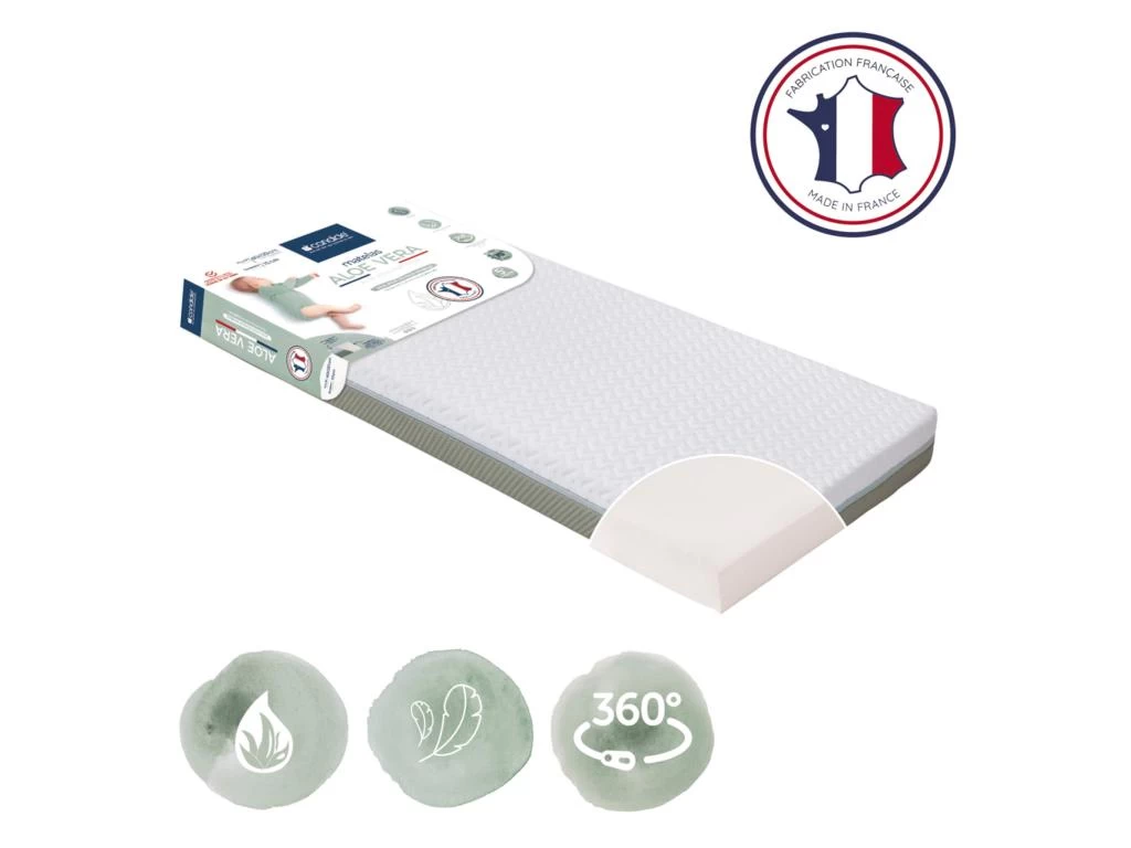Matelas bébé ALOE VERA, déhoussable. Epaisseur de 10 cm. Application d’Aloe Vera sur l’intégralité du coutil. Lavable en machine à 30°C.