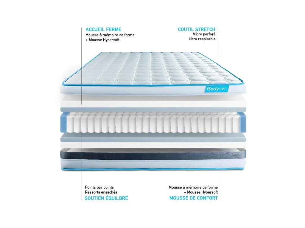 – Type de matelas : Mémoire de forme et ressorts ensachés