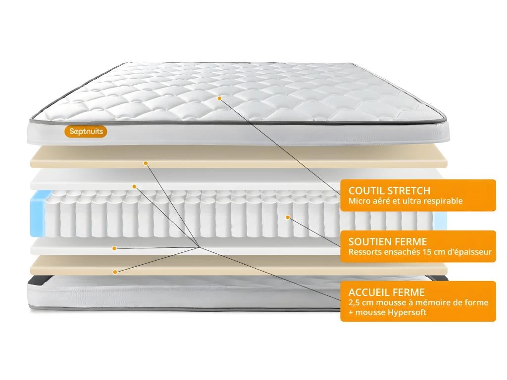 Le matelas Memo Spring de la marque Septnuits est constitué d’une âme en ressorts ensachés procurant un soutien très précis point par point avec 3 zones différenciées. Sa conception unique vous offrira un soutien ferme et un accueil dynamique. Sa Plate-bande 3D micro aérée, associée à son coutil micro perforé ultra respirable et sa fibre polyester vous garantissent une ventilation active du matelas. Sa maxi épaisseur vous assure une nuit de bien-être. Son plus ses ressorts ensachés pour une parfaite indépendance de couchage.