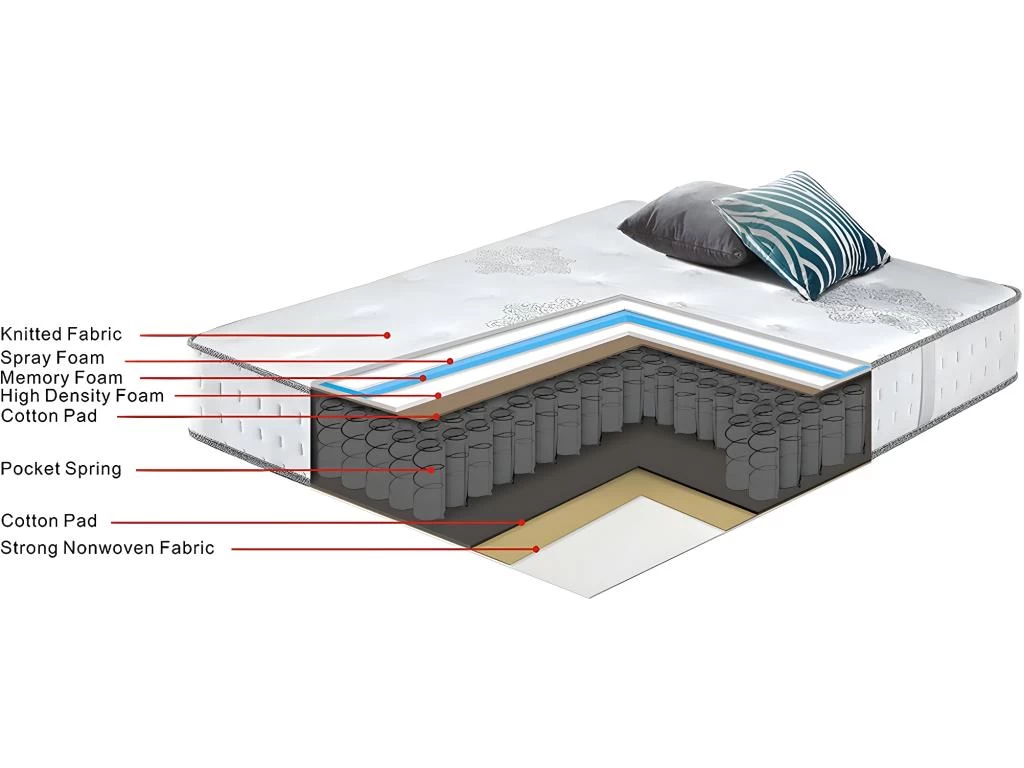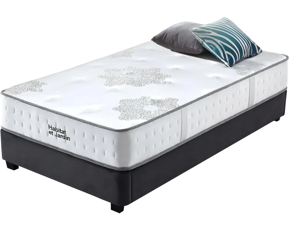 Ame : Ressorts ensachés et à mémoire de forme – 1.8 mm au milieu et 2.2 mm sur le reste de la surface Quantité de ressorts : 420 Hauteur : 22 cm.