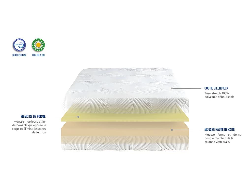 - Âme intérieure du matelas (certifiée CertiPUR) : 13 cm de mousse Haute Densité de 28 kg/m³ + 2 cm de mousse viscoélastique à mémoire de forme de 50 kg/m³