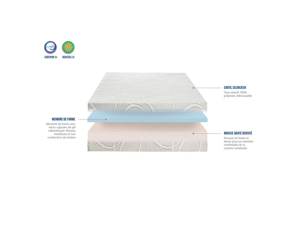 - Âme intérieure du matelas (certifiée CertiPUR) : 15 cm de mousse Haute Densité de 33 kg/m³ + 5 cm de mousse viscoélastique à mémoire de forme de 60 kg/m³ avec microcapsules de gel thermorégulateur
