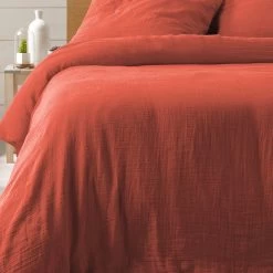 Parure de lit double gaze de coton terracotta Angelia. Grâce Ă sa matière double gaze de coton prĂ©sente sur une face de la housse, cette parure de lit vous offre un confort exceptionnel et un toucher ultra-doux, pour votre plus grand plaisir et bien-ĂŞtre. En effet, le double gaze de coton est reconnu comme Ă©tant un tissu très doux, fin et lĂ©ger, avec un effet froissĂ© et aĂ©rien, idĂ©al pour profiter de nuits très confortables et paisibles. De plus, cette parure de lit prĂ©sente un joli coloris terracotta qui s’adapte facilement Ă tout type de dĂ©cor !Â