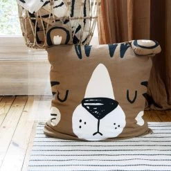 Vous retrouverez sur les deux faces de cette jolie housse de couette un imprimĂ© tigrĂ© beige et le visage du fauve sur la taie d’oreiller avec deux expressions faciales diffĂ©rentes entre le recto et le verso.Â