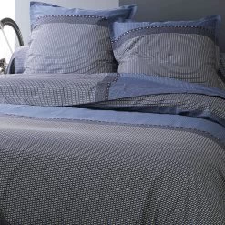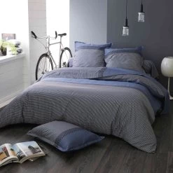 Parure de lit Enzo Tradilinge tissée en satin de coton. Grâce à son tissage serré de 110 fils/cm2, cette parure assurera douceur et bien-être. Très tendance, son imprimé dans les tons gris et bleus vient parfaire la décoration de votre chambre et apportera originalité et modernité. La housse de couette comporte un rabat de maintien de 37 cm aux pieds en forme de cheminée pour pouvoir y insérer la couette.